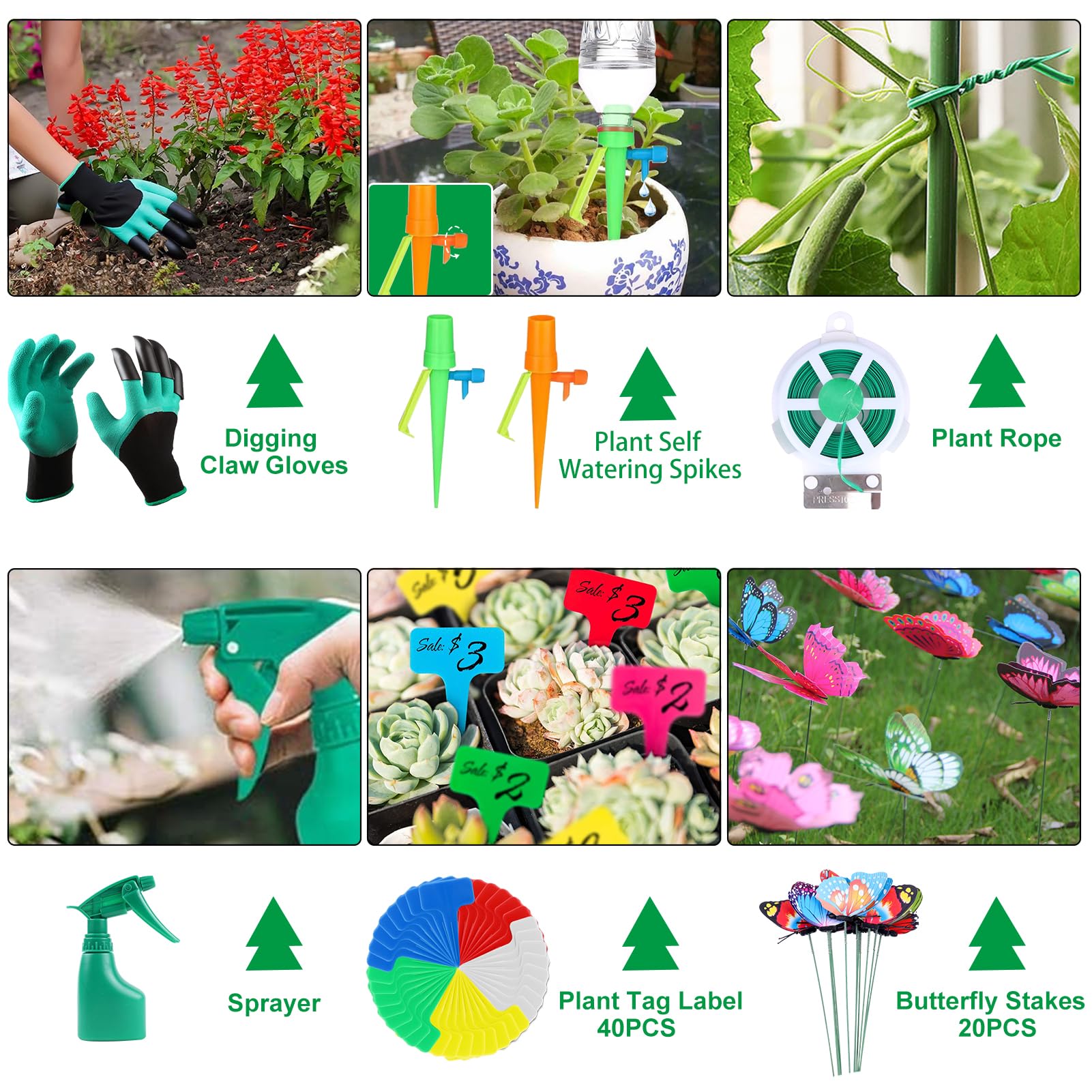 • ► 84 Pieces Upgrade Complete Gardening Tools Will Meet All Your Needs: Garden tool sets includes garden tools bag,pruning shears, transplanter,trowel,weeder,hand rake,cultivator, a pair of gloves,2pcs Plant Self Watering Spikes,sprayer,sowing seeds dispenser,40pcs plant labels, 20pcs butterfly stakes,50m plant rope,10 succulent plants tools.Our garden tool set helps you create a vibrant garden,lawn and yard.We went to great lengths to bring you Super Saver Value Pack($69.99 market retail value).