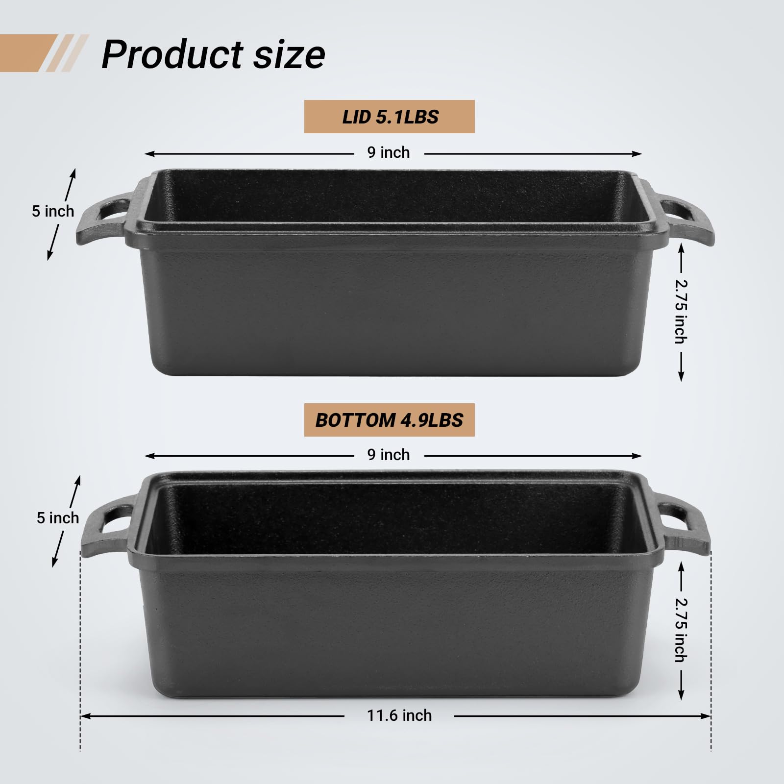 • 【9'×5' STANDARD LOAF PAN】2 in 1 sets cast iron loaf pan with lid give you more ways to use, it can be used separately as bread loaf pans for homemade bread, or as each other's lids when you need a perfect crisp crust, just like a dutch oven. It’s a must have for sourdough bread baking supplies.