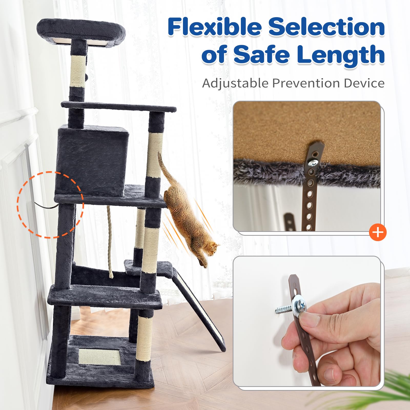 • DOUBLE STABILITY: The safety and stability of the cat tree is very important, especially when your cat is jumping and playing, so we added an anti-tipping kit to the center board. You can nail it to the wall for double protection.