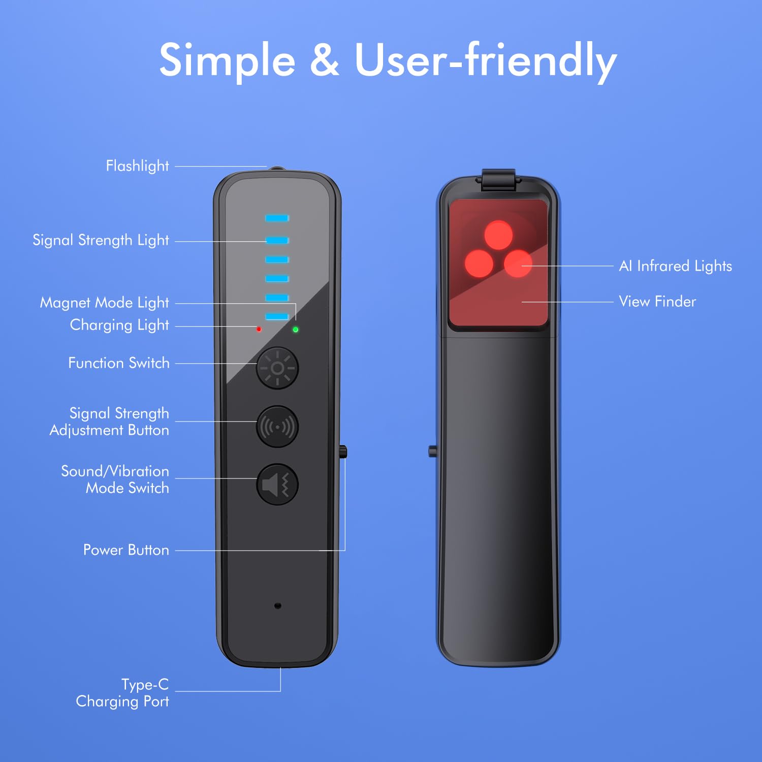 • Upgraded AI-Powered Detection: Military-grade technology detects hidden cameras, listening devices, and GPS trackers with precision. Enjoy peace of mind in hotels, offices, and even your own home. Stay one step ahead of hidden threats!