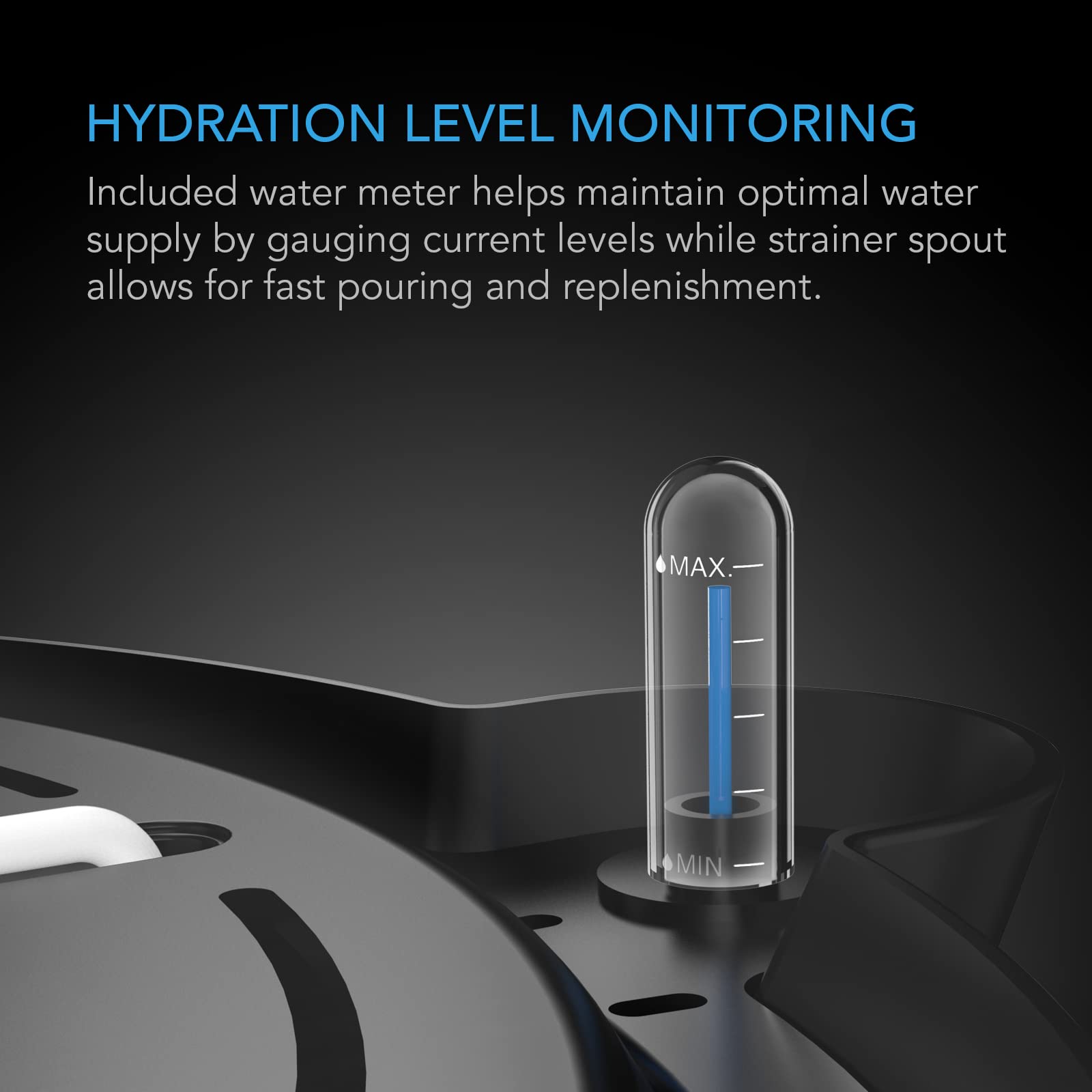 • Included gauge displays the current water level while the strainer spout enables quick replenishment.