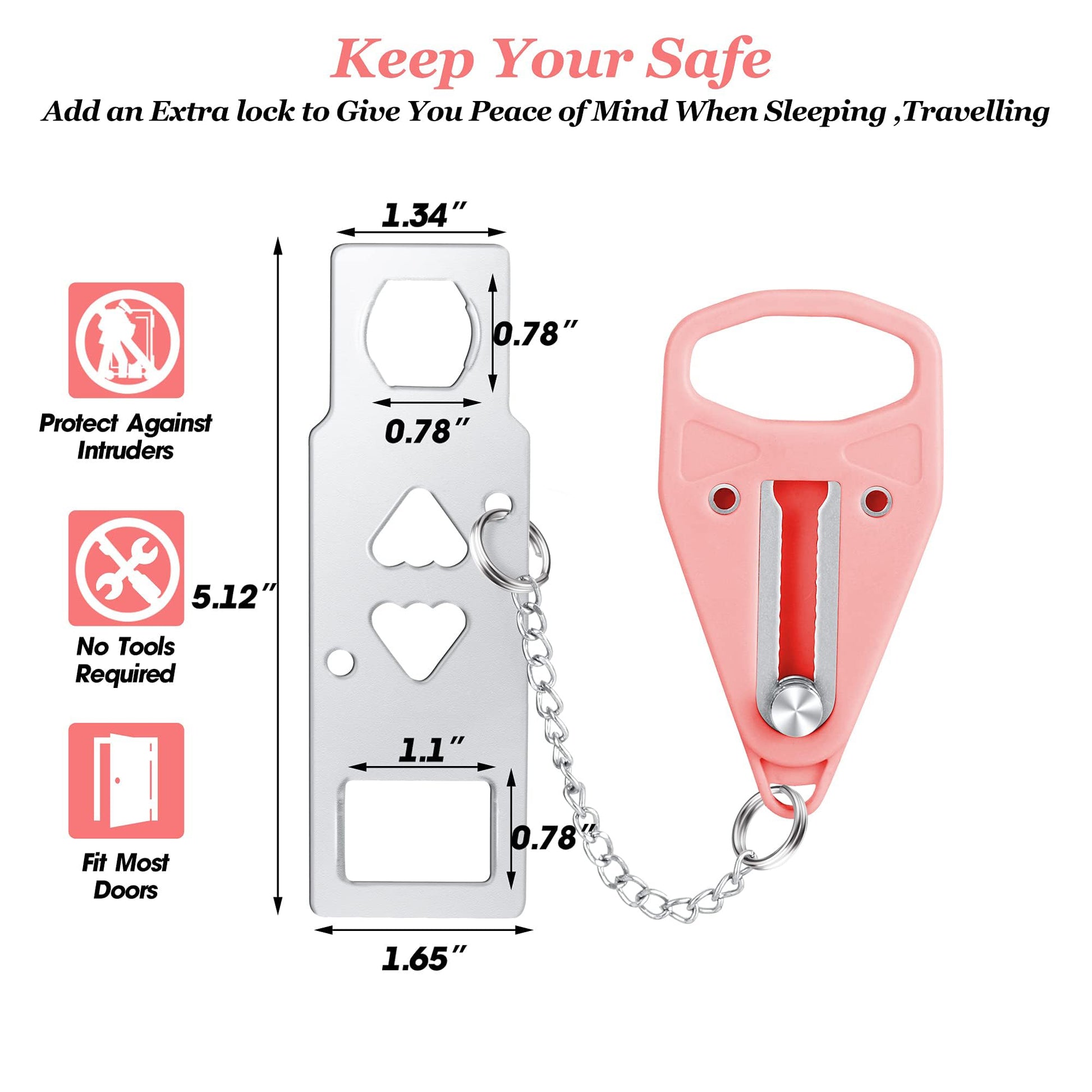 • Security and Privacy - This pink portable door lock provides you with extra security and privacy, safety locks for doors greatly improving your security and preventing unauthorized entry, so the door can't be opened from the outside, door lock security, not even with a key; door security bar is a great helper for you when you are on business and travel, or live alone. It is also a personal safety device for women.