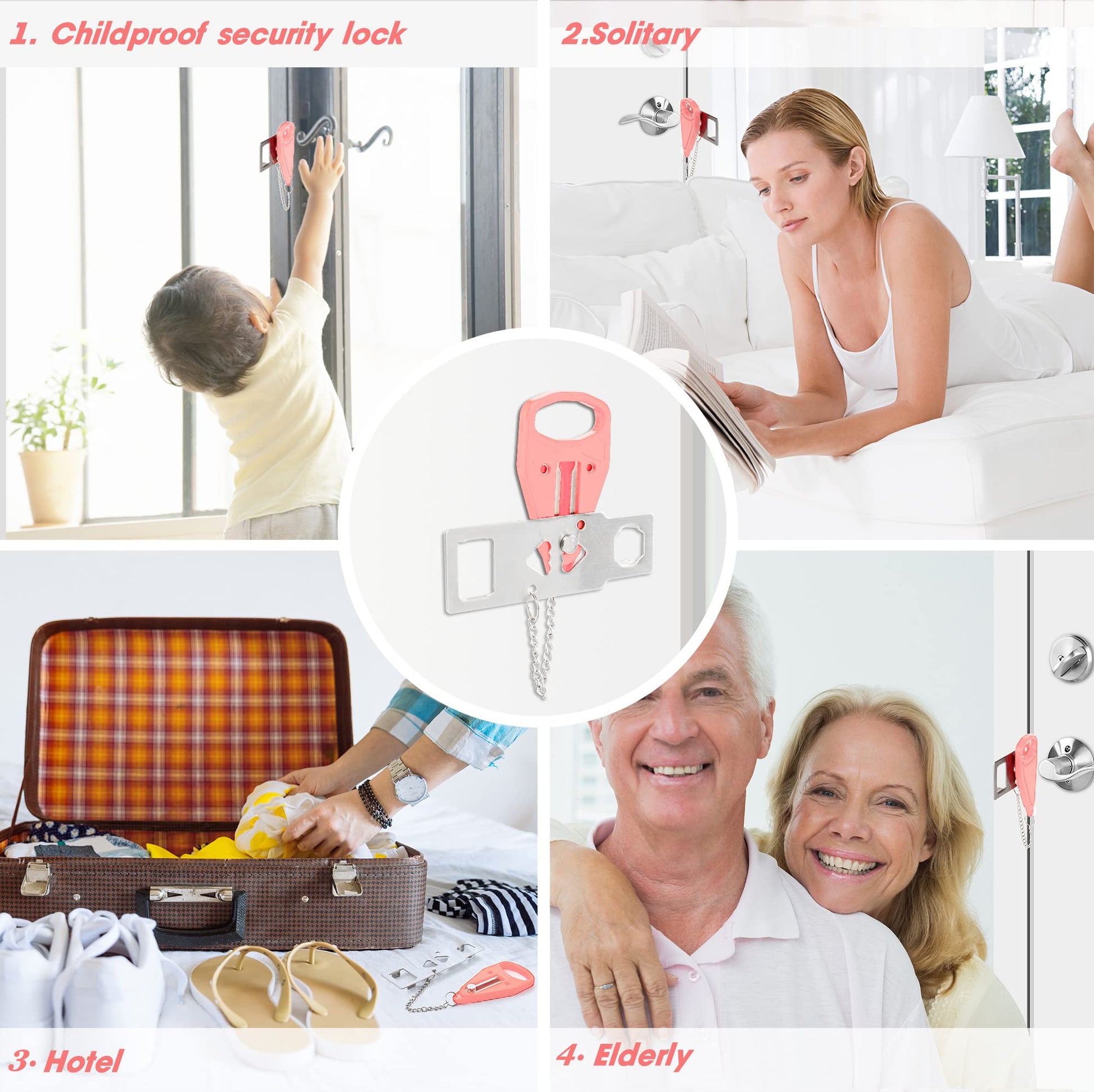 • Easy to Use - Easy to install or remove, this hotel lock can be installed in seconds without any tools, locks for doors bring apartment security, even in emergency situations and in the dark. Just insert the metal piece into the slot of the door lock, close the door, and then put the pink handle groove to the stud on the metal sheet, then no one can open the door from outside.