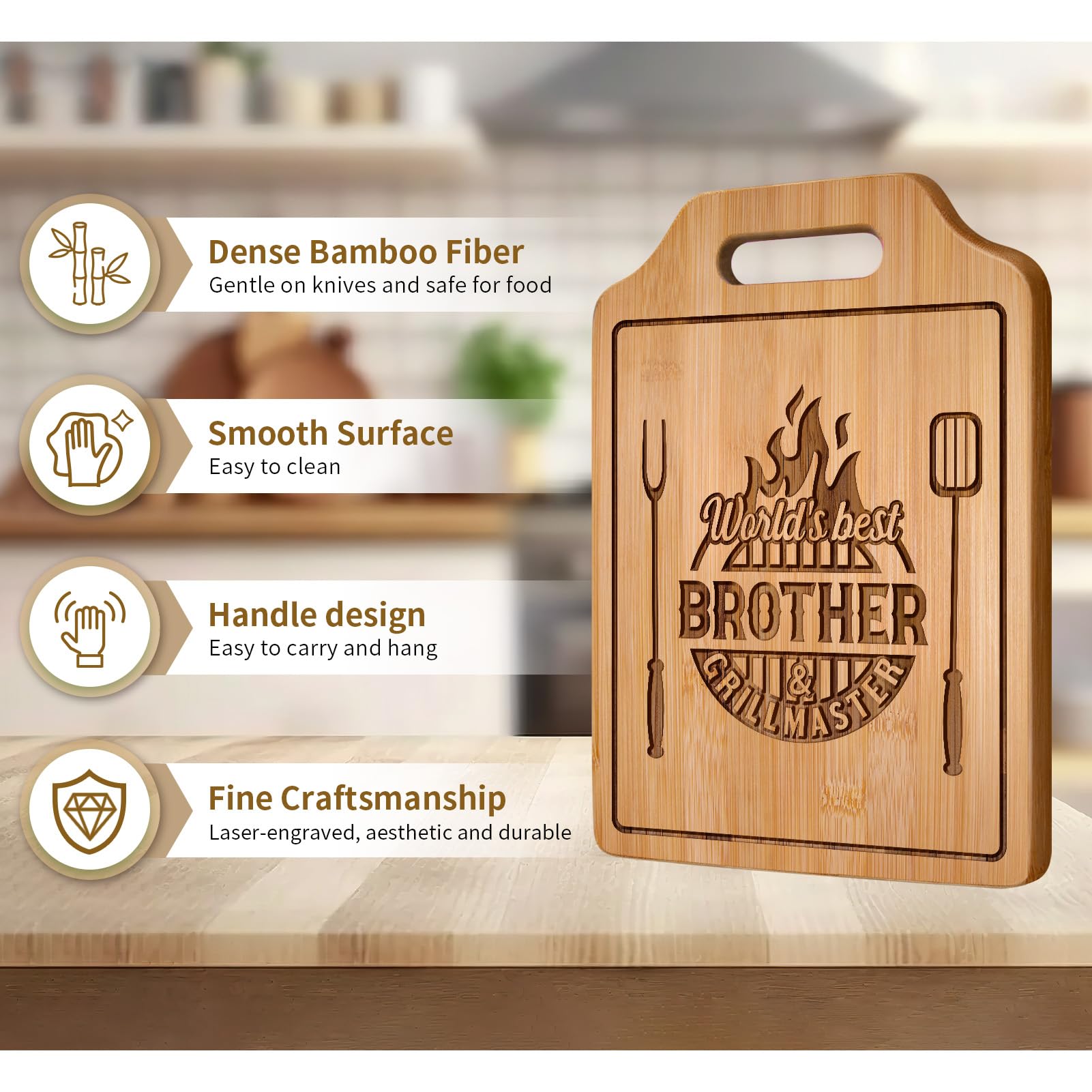• Gifts for Brother Gifts: Looking for a unique brother gifts for brother adult? This brother-themed bamboo cutting board is a perfect choice. Engraved with "World's Best BROTHER & GRILLMASTER" and a stylish kitchen fork design, it's a thoughtful and cool gifts for brother gifts