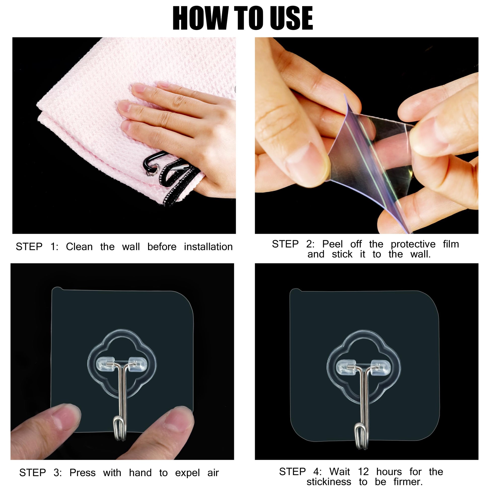 • High Load-bearing: First wipe the wall clean, tear off the protective film and stick adhesive hooks heavy duty on the wall, press with your hands to discharge the air bubbles inside.If you want to withstand overweight objects, you can wait for 12 hours before using the utility hooks, the effect is better, and the maximum weight can reach 33pounds,however, it is not recommended to load overweight items for a long time, especially expensive items.
