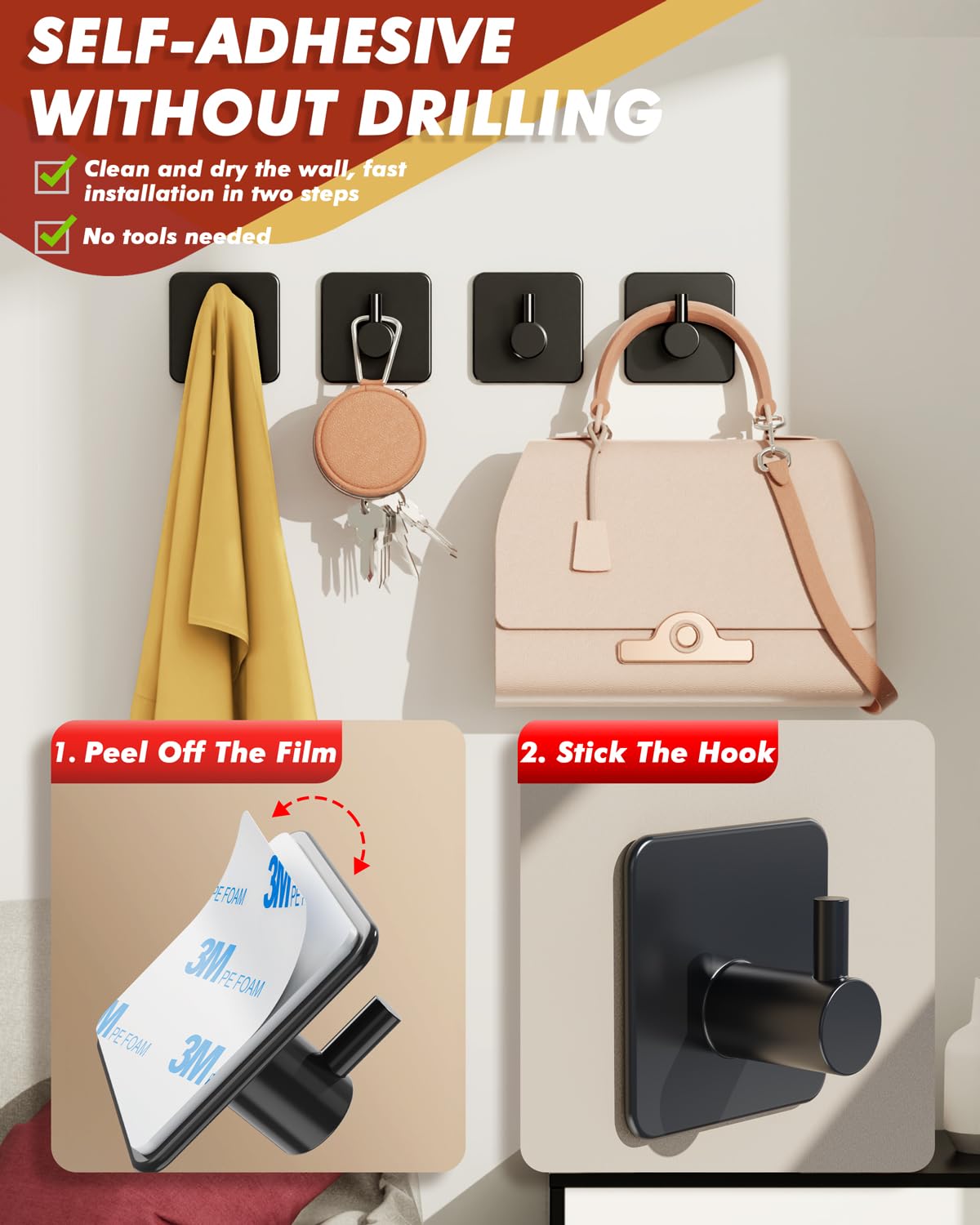 • ๐’๐“๐‘๐Ž๐๐† ๐€๐๐ƒ ๐„๐€๐’๐˜ ๐“๐Ž ๐ˆ๐๐’๐“๐€๐‹๐‹ - With the strong adhesive pad on the back(you can heat the adhesive pad with a hairdryer before installation for a better adhesion effect), these adhesive towel hooks can be easily installed on smooth surfaces, eliminating the need for drilling or damaging walls. The modern design and fashionable black color not only complement various home decor styles but also save space and keep rooms clean and tidy, making them a perfect addition to foyers, kitchens, hallways, bedrooms, and closets.