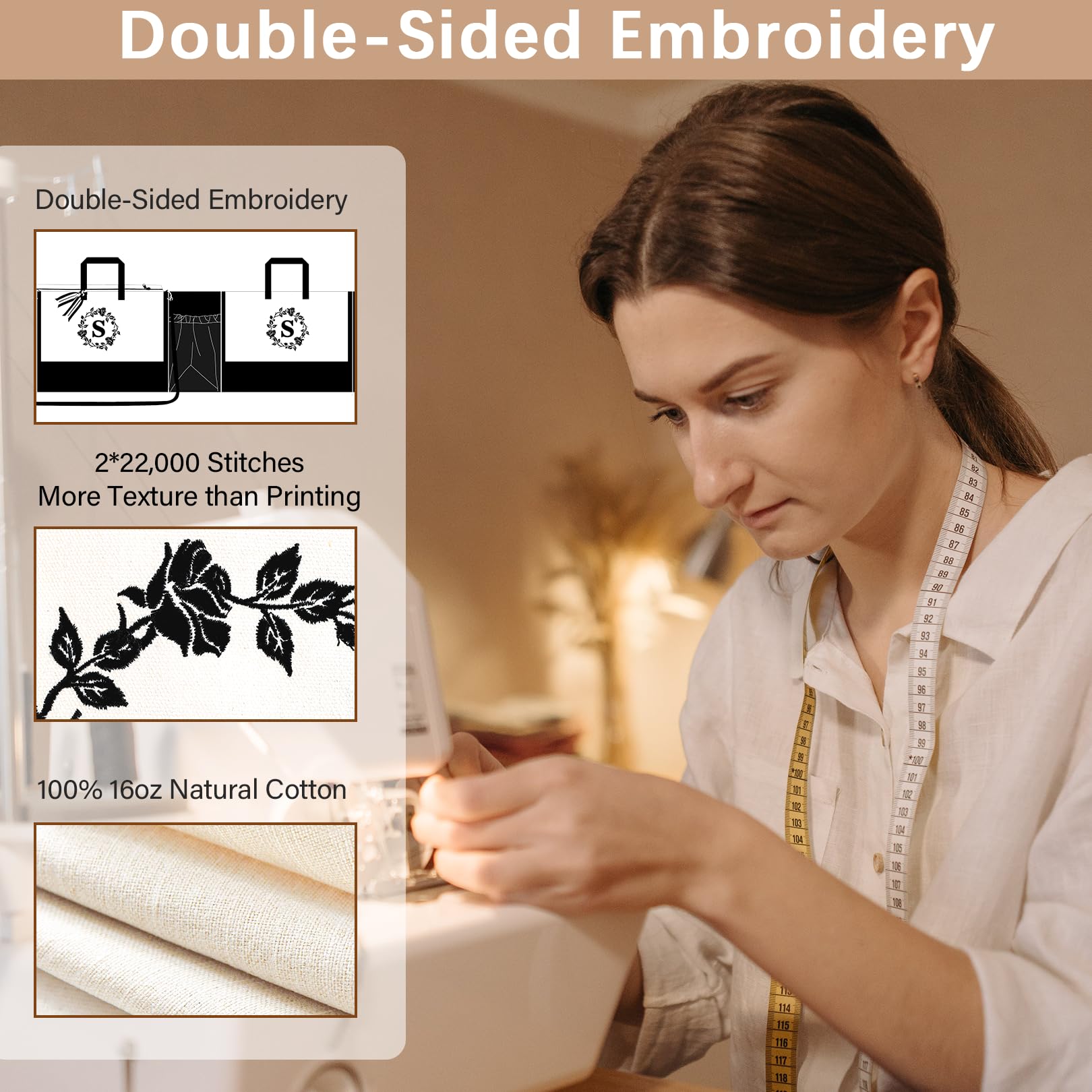 • COME WITH A COSMETIC BAG, Card bag (key bag) & DOUBLE-SIDED MONOGRAM EMBROIDERY: You will receive a women's canvas beach bag, plus a makeup bag and a card holder (key pouch). The makeup bag and cardholder feature matching letters as the canvas tote. Our women's bags have high-density double-sided embroidery instead of simple printing, free from strong odors for an eco-friendly touch. Personalize the gift for the lady by choosing letters that represent her name