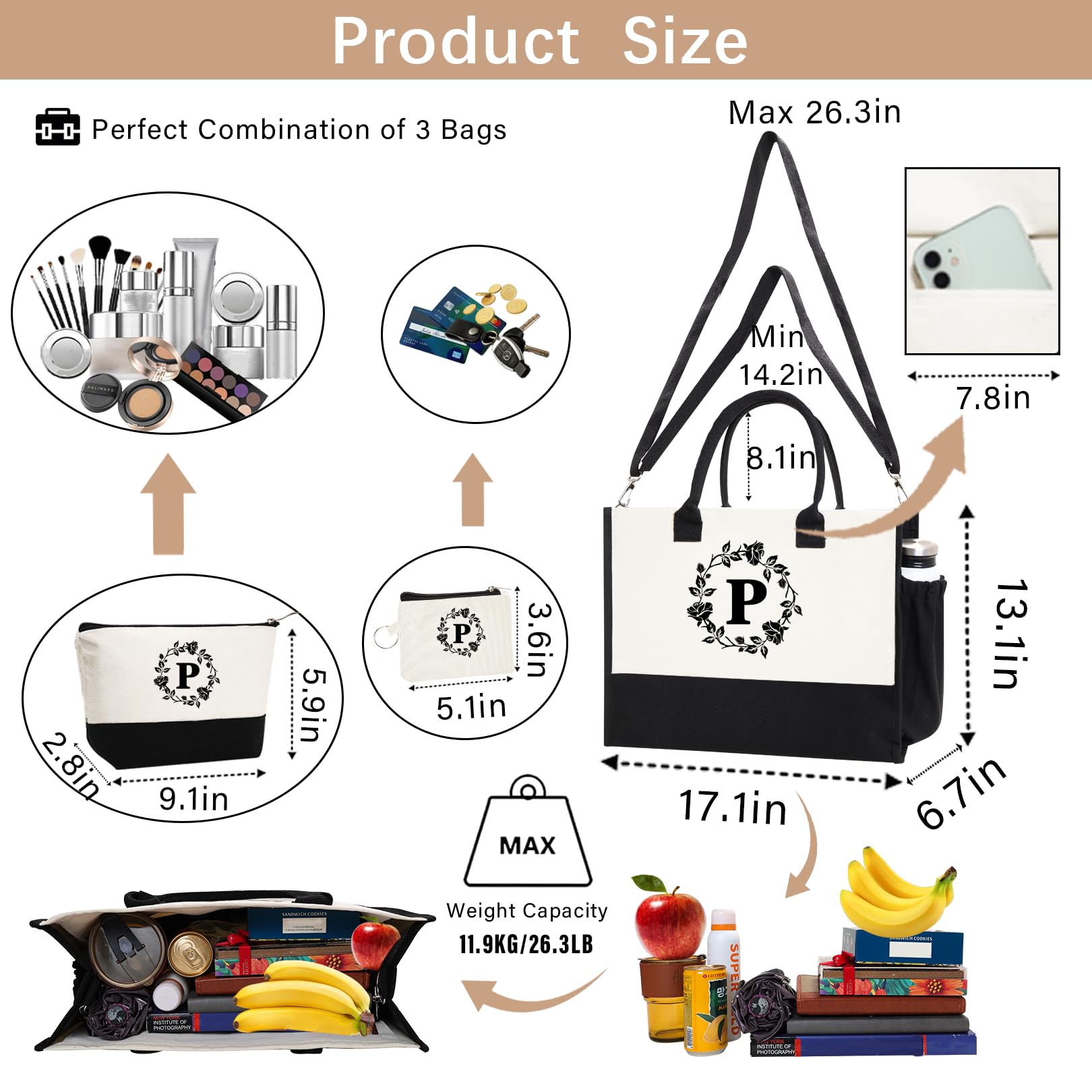 Adoryoung Monogram Personalized Initial Canvas Tote Bags for Women, Double-sided Embroidery Tote Beach Bags Gifts for Women (P)