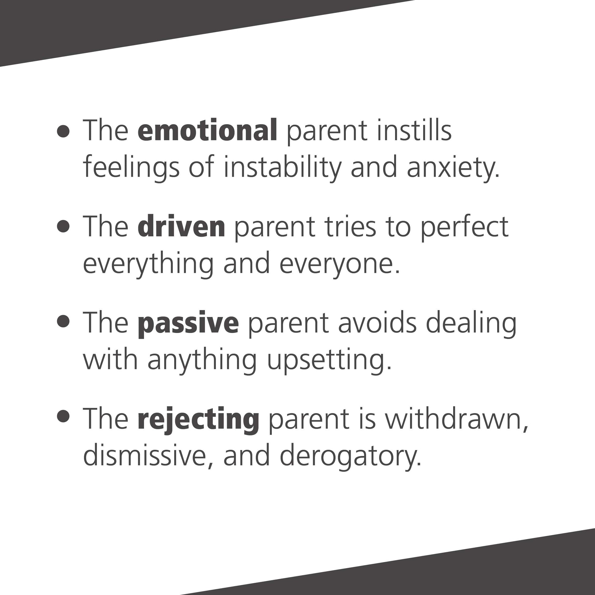 Discover the four types of difficult parents: The emotional parent instills feelings of instability and anxiety The driven parent stays busy trying to perfect everything and everyone The passive parent avoids dealing with anything upsetting The rejecting parent is withdrawn, dismissive, and derogatory
