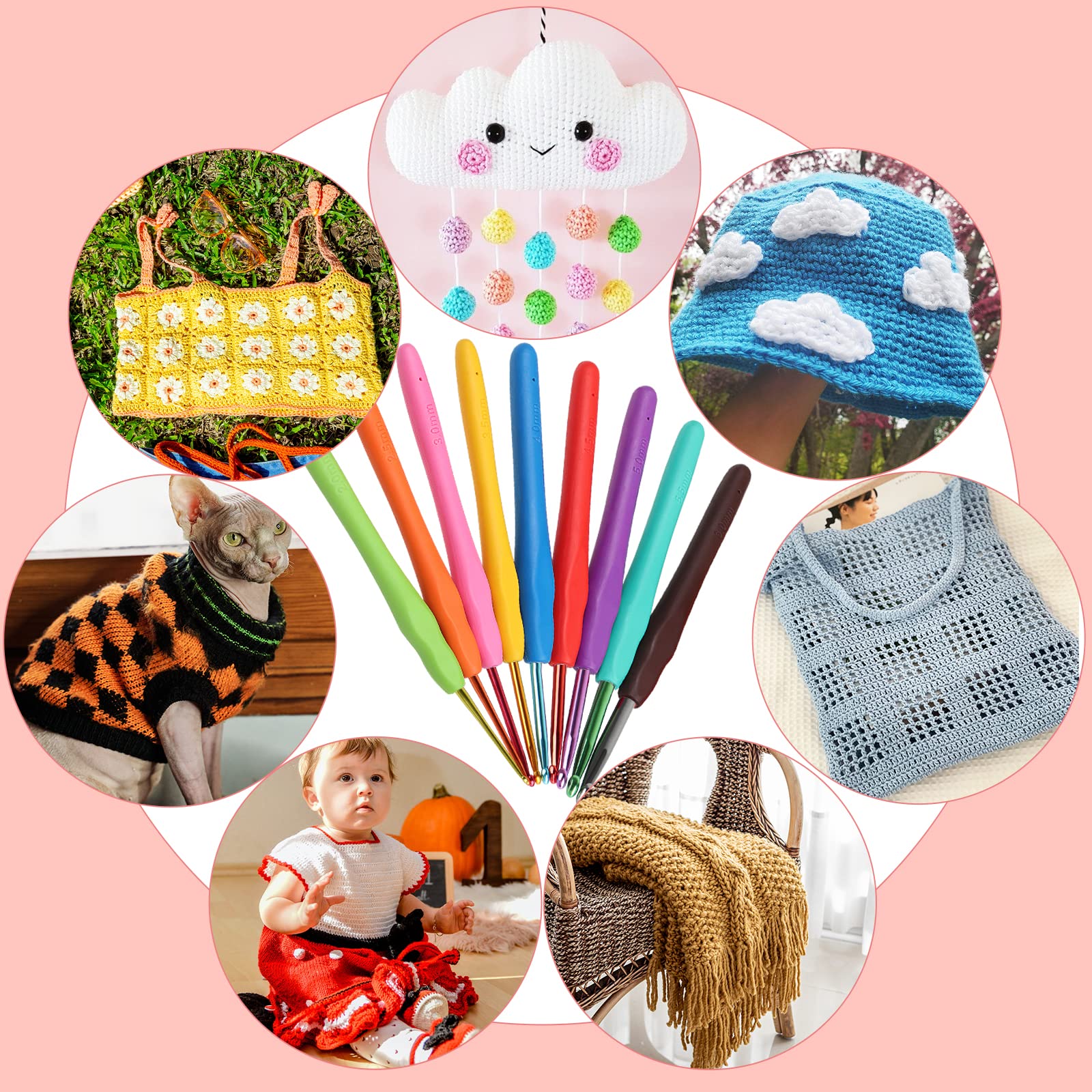 • [Complete Crochet Kit] This crochet hooks kit includes 59 pcs different crochet hooks and crochet accessories: 9 ergonomic soft handle crochet hooks (2.0-6.0 mm), 12 lace crochet hooks(0.6-1.9 mm), 5 balls of yarn, 10 stitch markers, 6 plastic sewing needles, 4 plastic U-shaped needles, 3 plastic cable needles, 3 stitch holders, 2 pompom makers, 1 needle gauge, 1 scissors, 1 tape measure, 1 winding board and 1 pink zip storage bag. Complete crochet kits for beginners and adults.