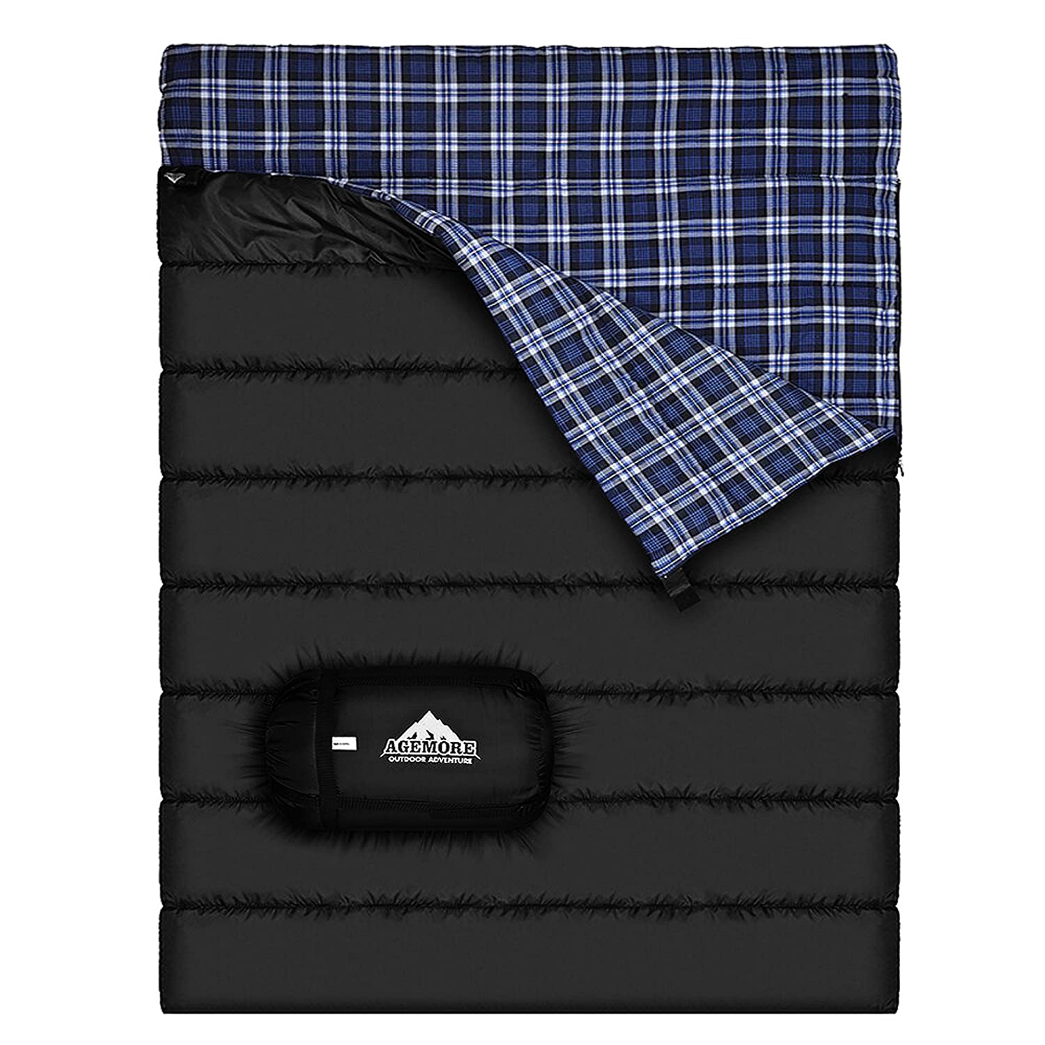AGEMORE Cotton Flannel Double Sleeping Bag for Camping, Backpacking Or Hiking. Queen Size 2 Person Waterproof Sleeping Bag for Adults Or Teens. Lightweight with Compression Sack