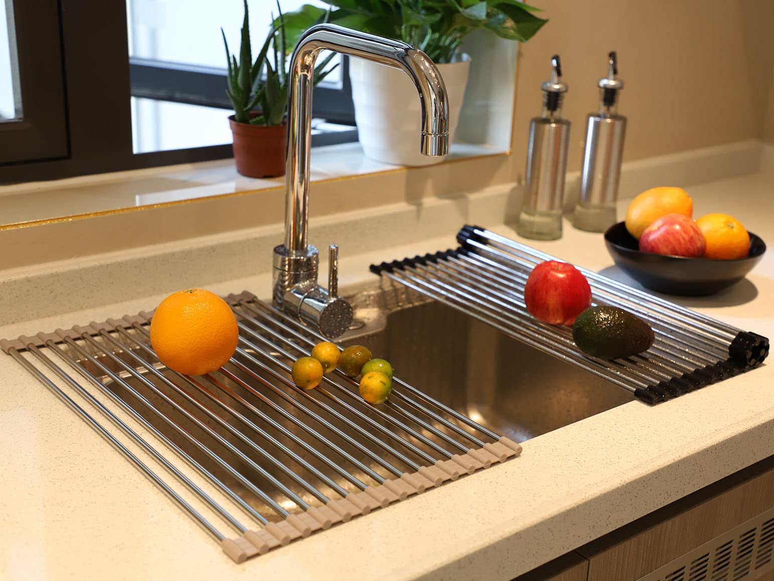 • Newest Displayed Dimension:17.8"(L) x 11.8"(W) X 0.5'' (H). SUS304 Stainless Still Pipes. Please kindly measure your sink size firstly before purchasing this roll up over the sink dish drying rack! Great Gift for Valentine’s Day, Easter, Mother's Day, Father's Day, Birthday, Halloween, Thanksgiving, Christmas, New Year, family members and all festivals Gifts