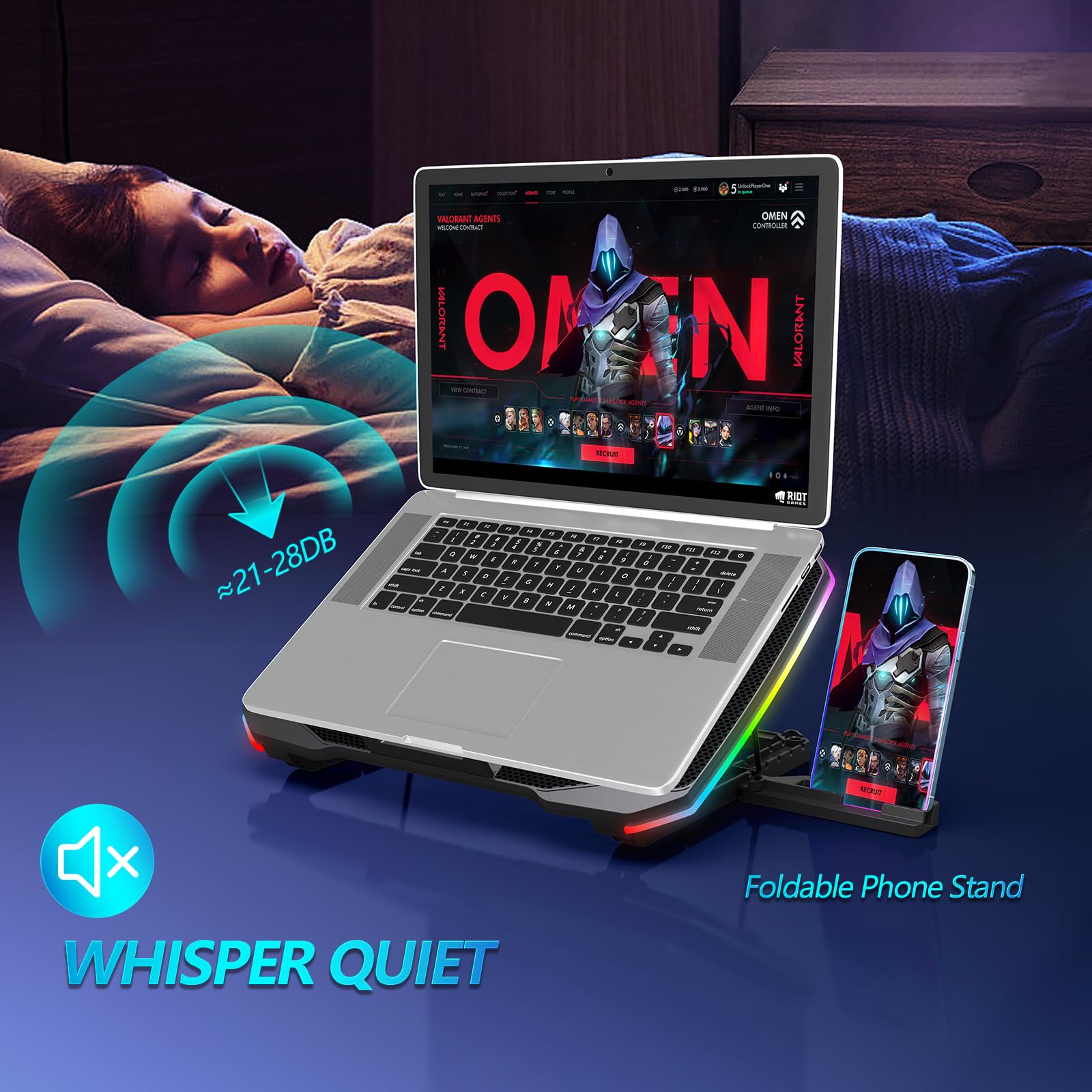 • 【Anti-Slip Baffle & Convenient Phone Holder】Designed for laptops up to 17 inches, the laptop cooling fan features a foldable baffle to prevent slipping and dropping. It also has a hidden phone holder that folds behind the stand when not in use