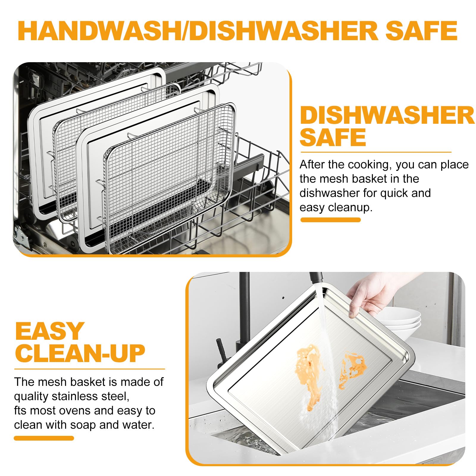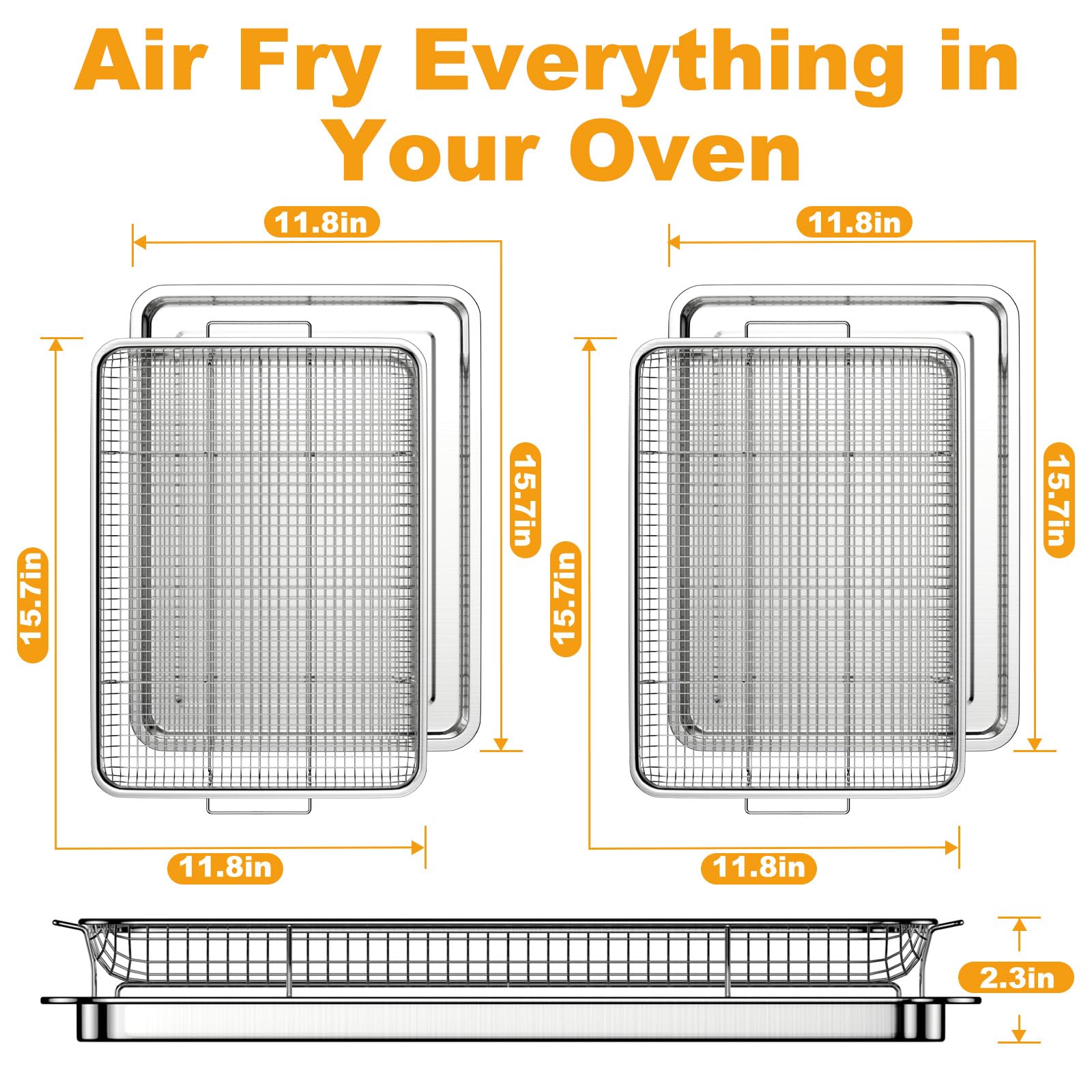 • 【Extra Large Size for Family or Entertaining】Stainless steel air fryer basket measuring 15.7x11.8 Inches means you can cook more food at once, saving you time and energy. Works well with oven air fryer function, whether you're feeding a family or entertaining guests, this oven crisper tray and pan set can handle it all.