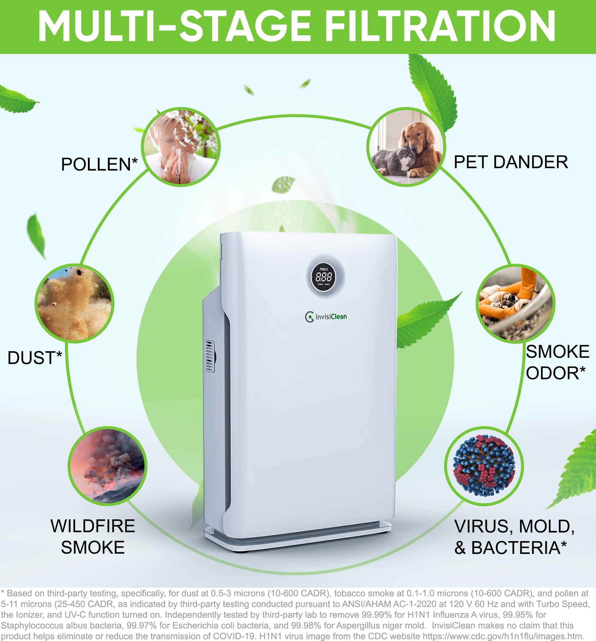 • π–π‡πˆπ’ππ„π‘ ππ”πˆπ„π“: The optimized air channel and larger filter allow air to flow more smoothly resulting in a ultra quiet air purifier. InvisiClean air purifier captures common allergy triggers, including dust, pollen, smoke, and pet dander, so you can breathe better air in your home, bedroom, or office. Independently tested, medical grade air purifier exceeds 99.97% standard with an H13 filter that captures 99.989% of 0.1 micron particles.