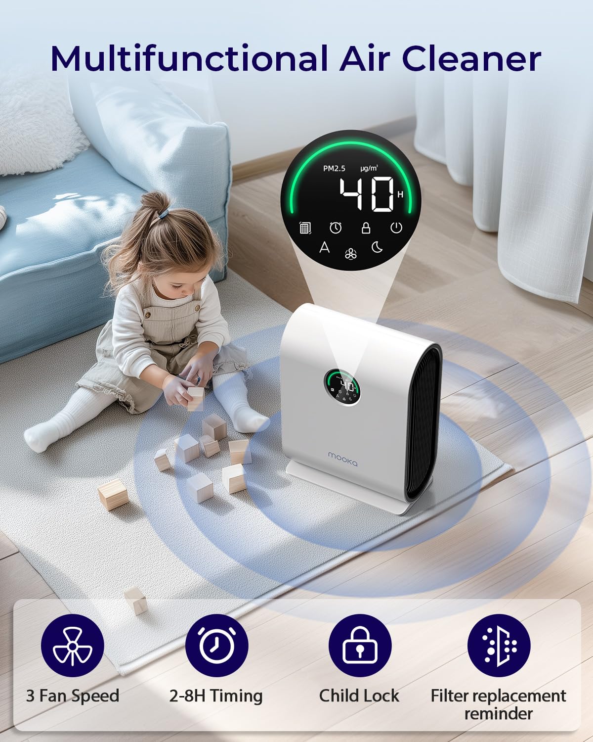 • PM2.5 AIR QUALITY DISPLAY & AUTO MODE: MOOKA KJ217 air purifiers for home large room is equipped with a smart PM2.5 sensor, which monitors the air quality in real time and displays air quality levels on the air purifier screen. In Auto mode, the fan speed will automatically adjust according to the air quality of the environment. No need to worry about bad air affecting your life