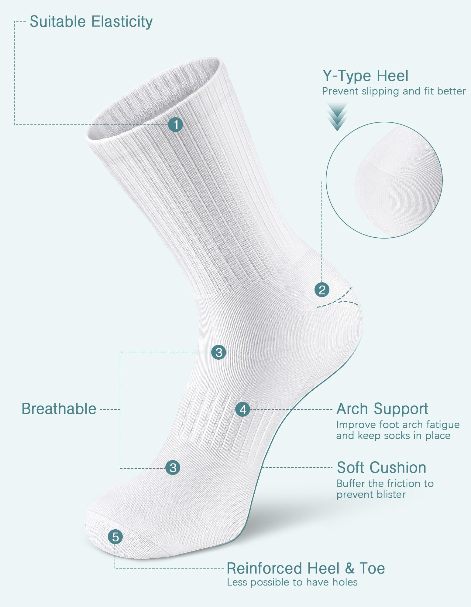 • [FULL CUSHIONED SPORT SOCKS]: Crew socks provide better support, constructed with soft plush sole cushioning for extra durability and softness in high-wear areas, reduce the impact on the knee. Elastic arch support and mesh top design are provided with proper compression force, meanwhile, can also keep in good air permeability. Comfortable seamless toe ensures protection against yarn chafing and irritation caused by traditional toe seams.