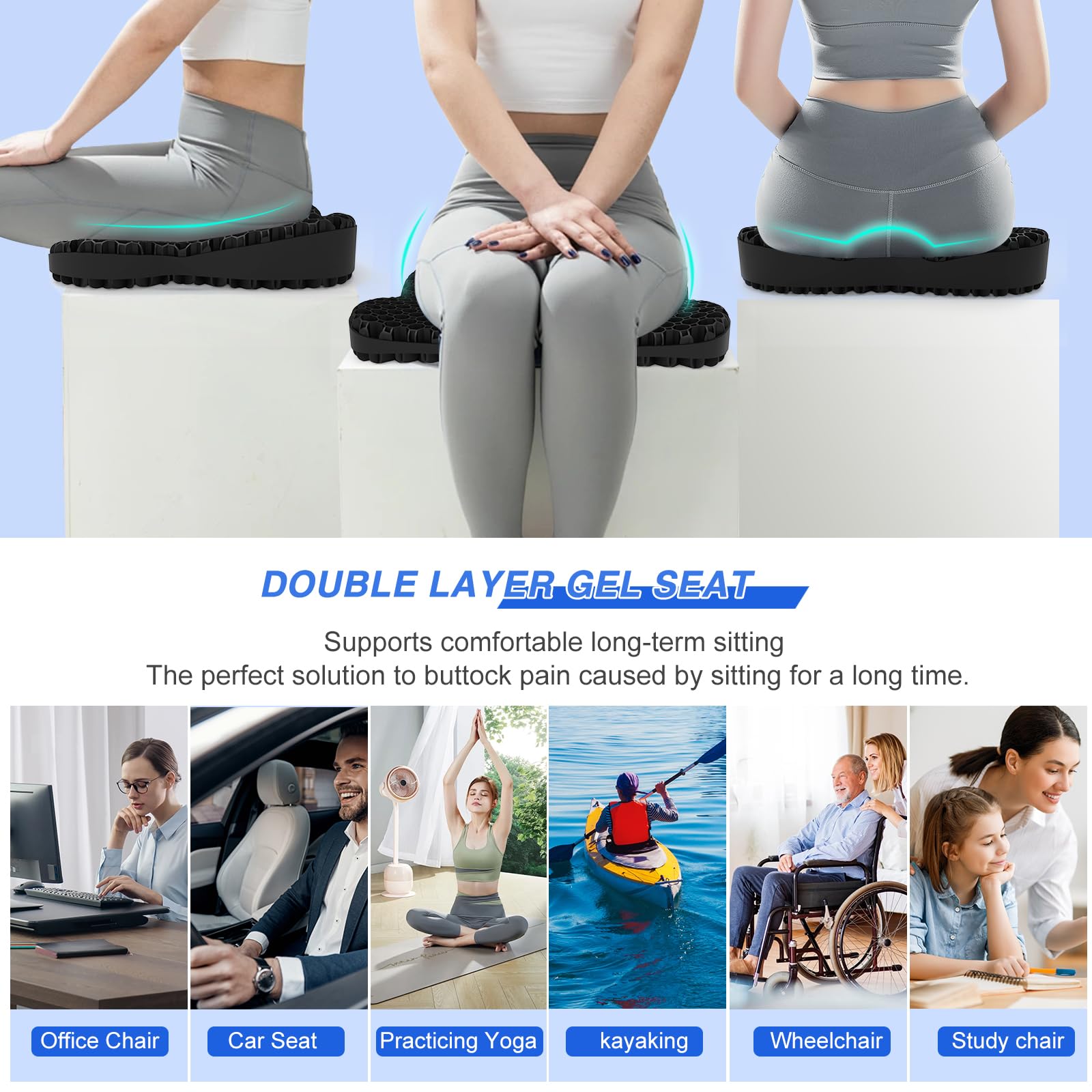 • Multi-Use Gel Seat Cushion: Suitable for office chairs, wheelchairs, cars, and desks. Ideal for yoga, pregnancy, and long-distance travel. The black cover is removable and washable for easy cleaning