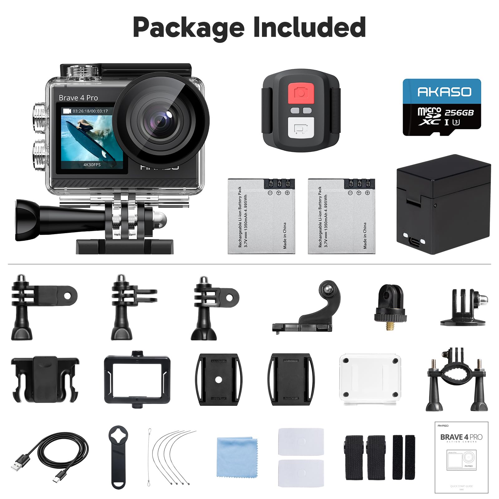 AKASO Brave 4 Pro 4K30 Action Camera with 256GB MicroSD U3 Card 131FT Underwater Waterproof Camera EIS Touch Screen Remote Control with 2x1350mAh Batteries and Helmet Accessories Kit Bundle
