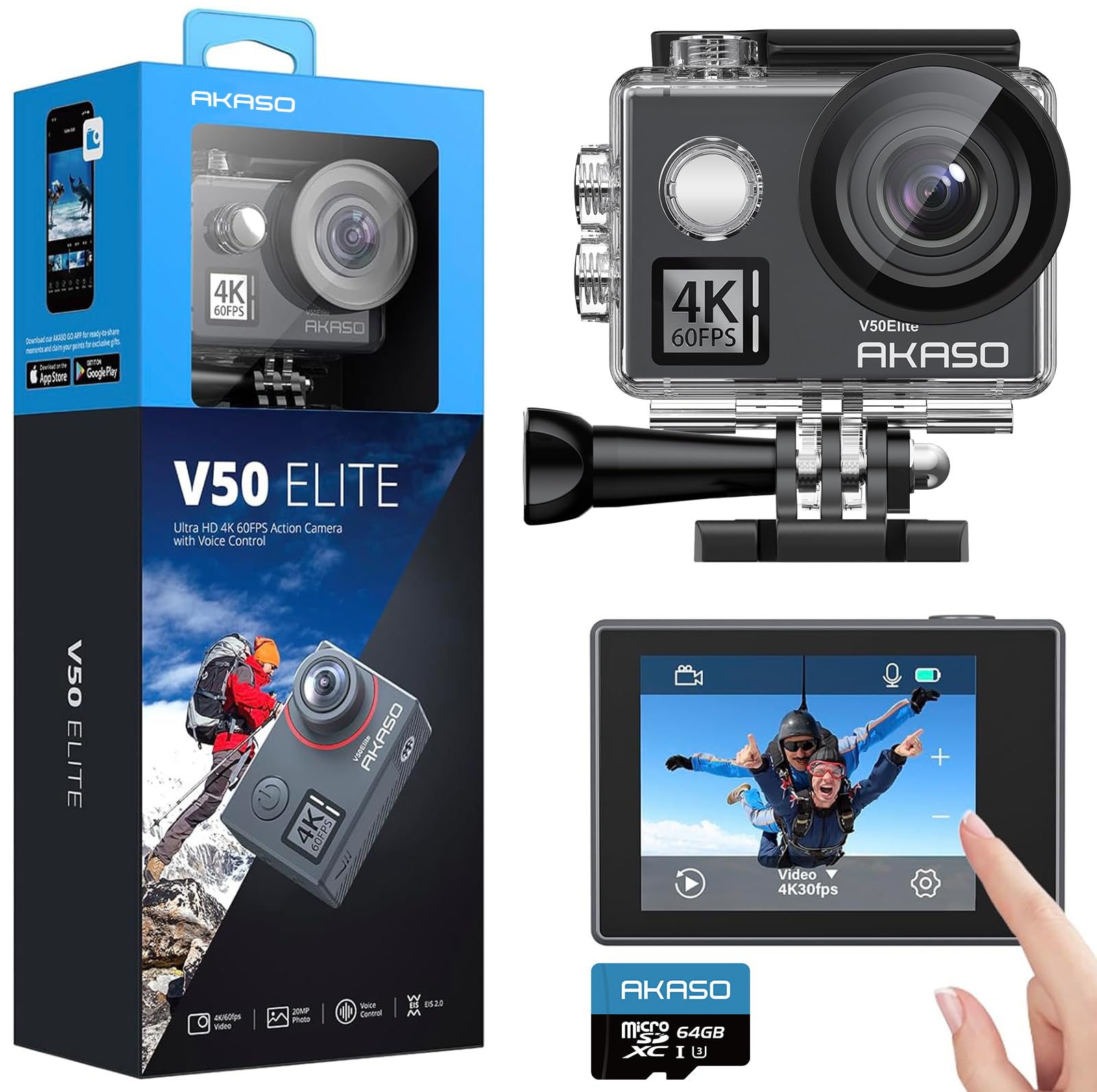 AKASO V50 Elite 4K60fps Touch Screen WiFi Action Camera Voice Control EIS 131 feet Waterproof Camera 8X Zoom Remote Control (with 64GB MicroSD Card)