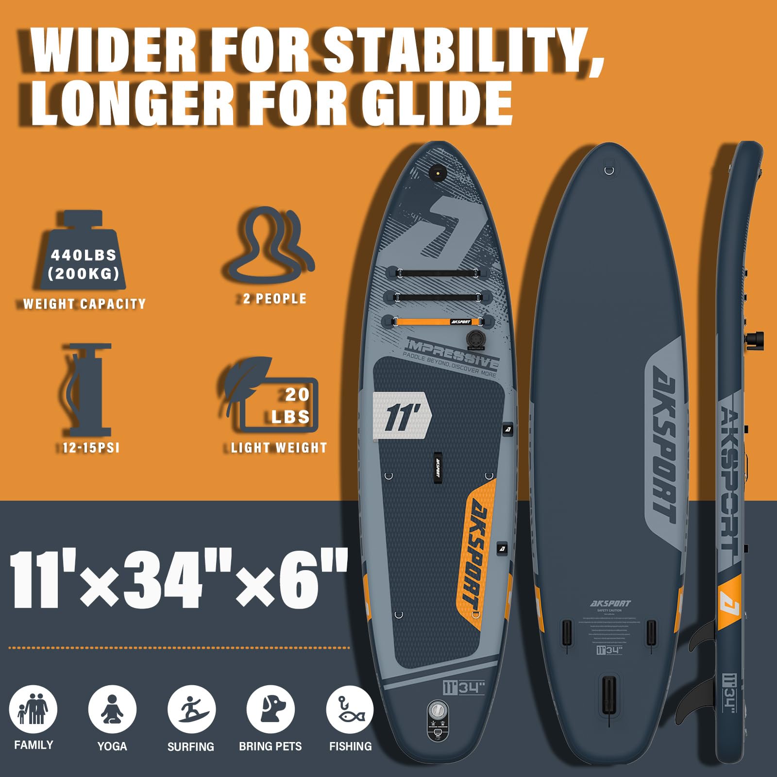 AKSPORT 11' x 34'' x 6'' Inflatable Stand Up Paddle Board SUP with Full Accessories,Wide Stable Design, Non-Slip Deck- 2-in-1 Convertible SUP/Kayak for Paddling/Fishing