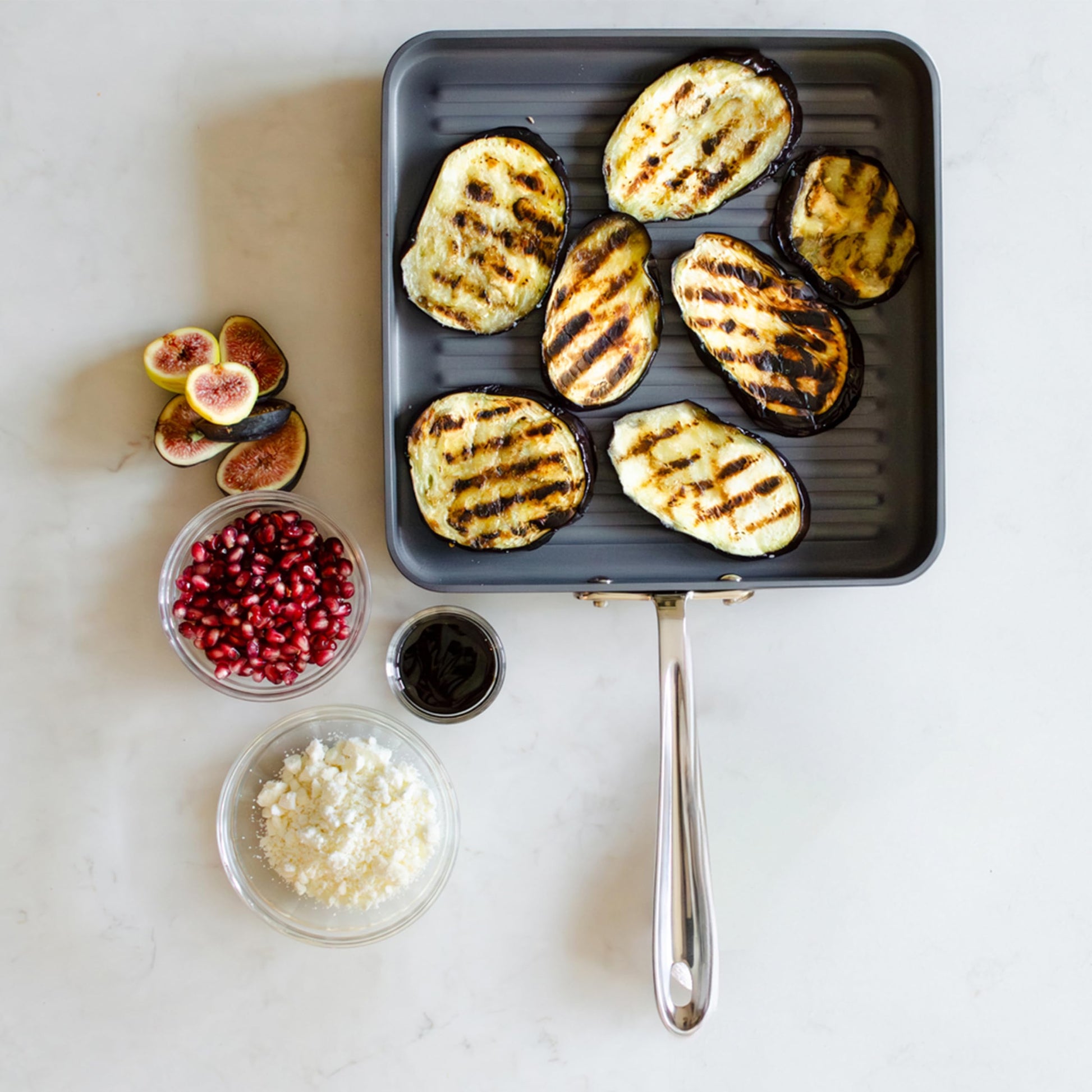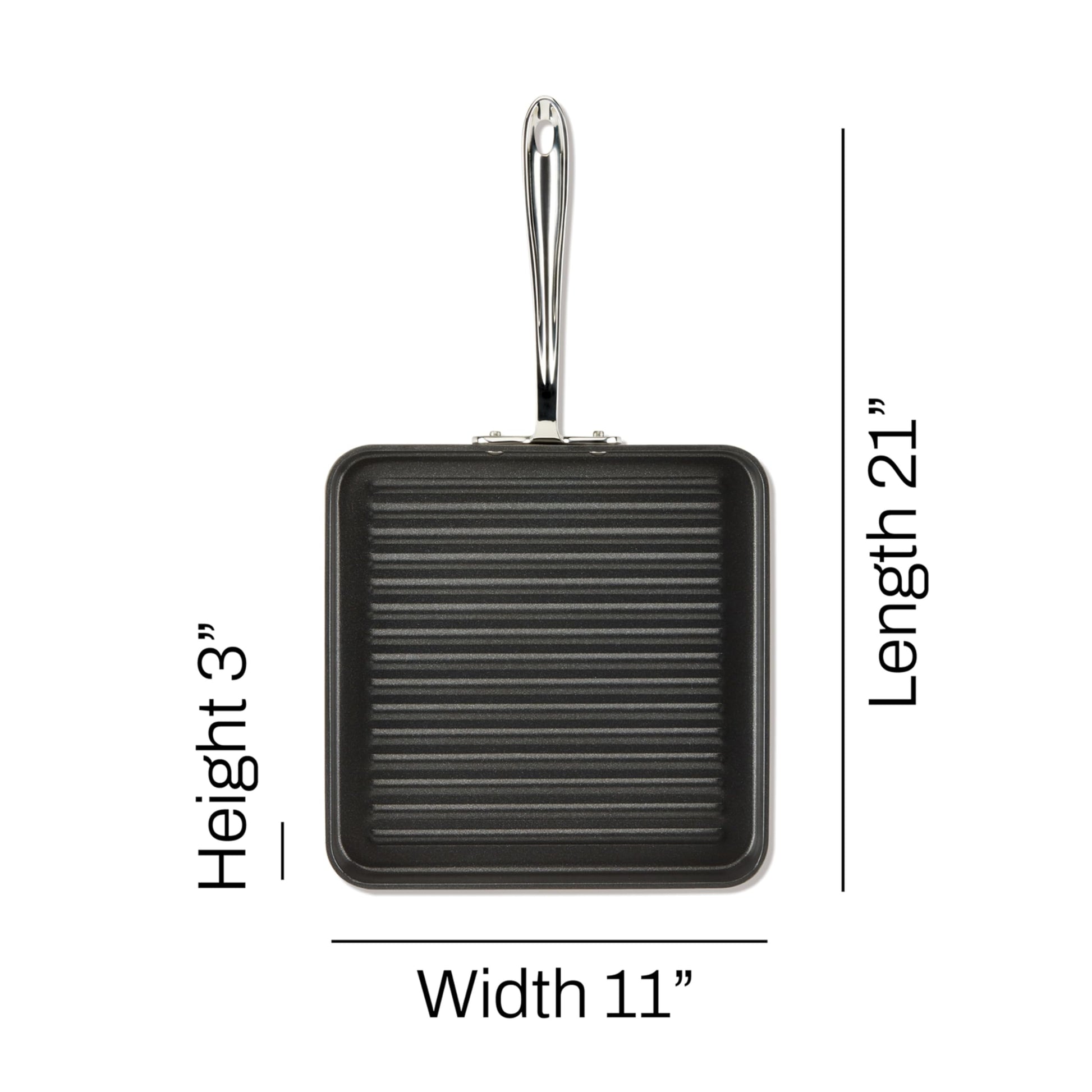 • The HA1 Hard Anodized Nonstick 11 inch Square Grill features an open surface with low walls for easy flipping and raised ridges for capturing beautiful searing marks and releasing fat.