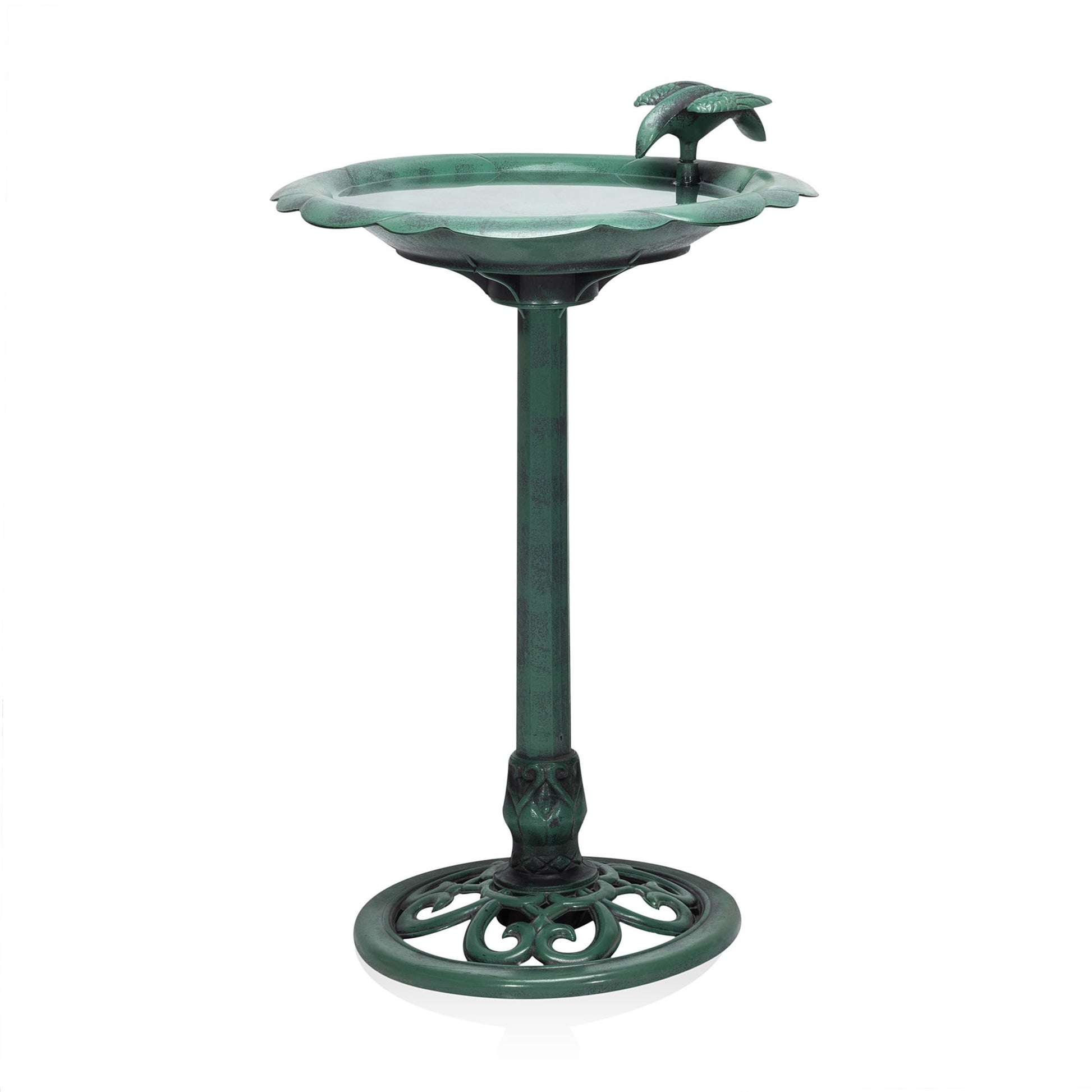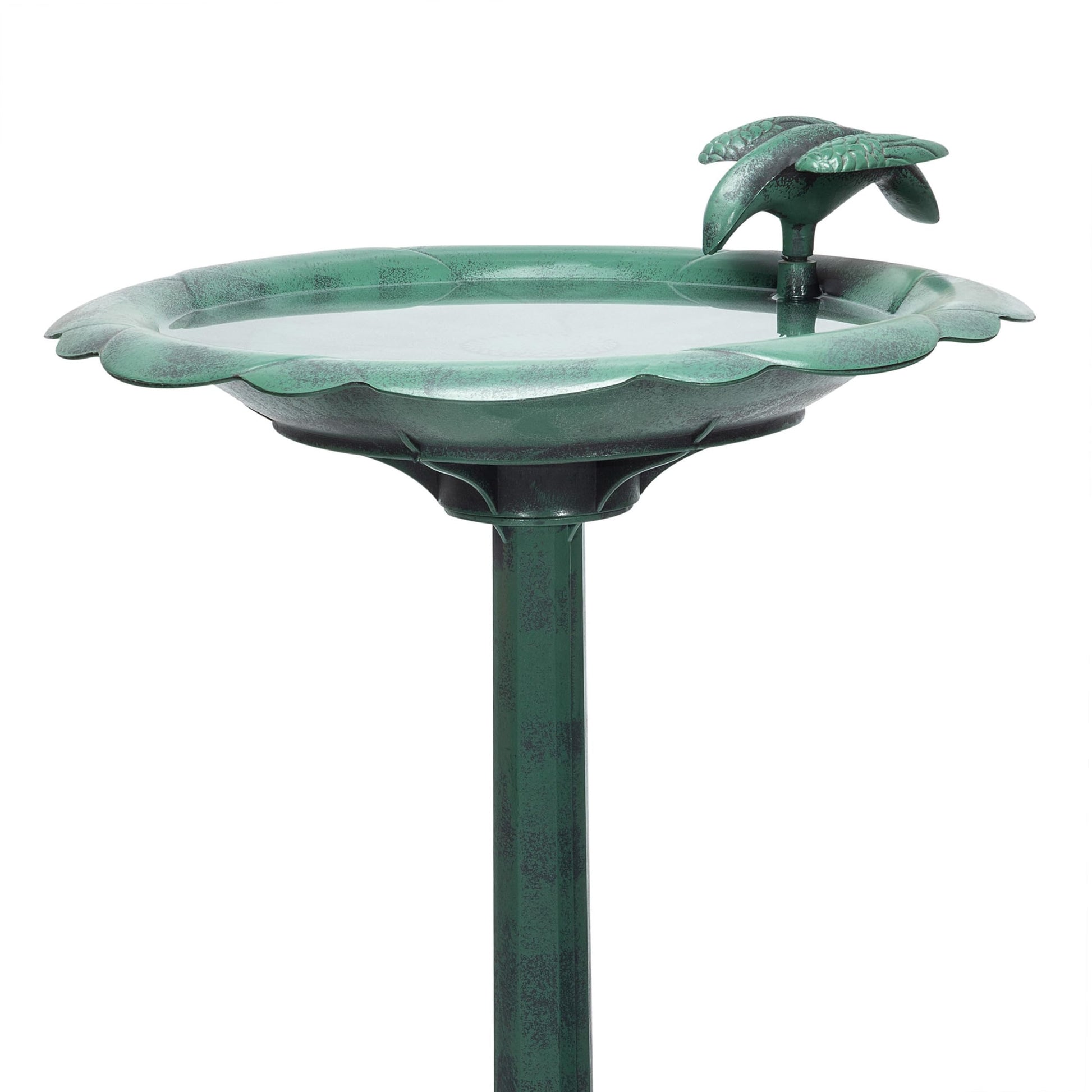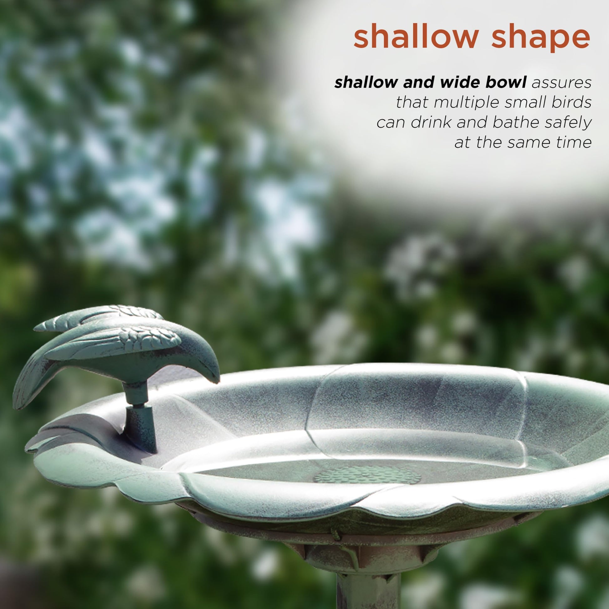 BEAUTIFUL ANTIQUE DESIGN: Featuring a timeless antique inspired flower design, this birdbath blends beautifully with natural surroundings. The natural green finish complements the outdoor environment, while the decorative bird perched on the rim adds an extra layer of charm. The base also offers space for planting flowers, providing you with a customizable option to enhance the birdbath's aesthetic appeal.