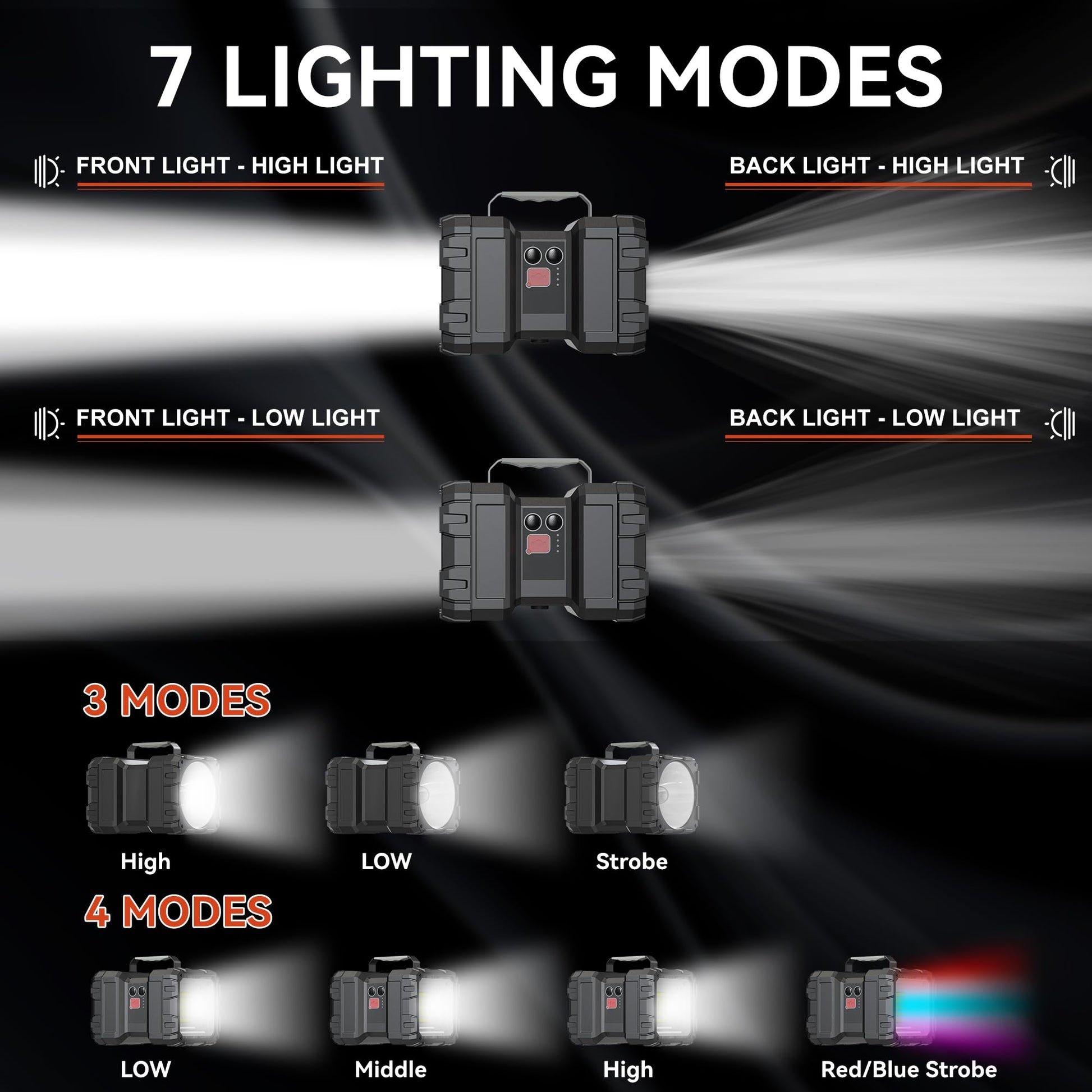 • MULTIPLE LIGHTS MODES: Rechargeable led flash light both heads can easily switch between weak-medium-strong three brightness modes with one click; Emergency light, the red/blue strobe lights SOS mode can be used for outdoor help