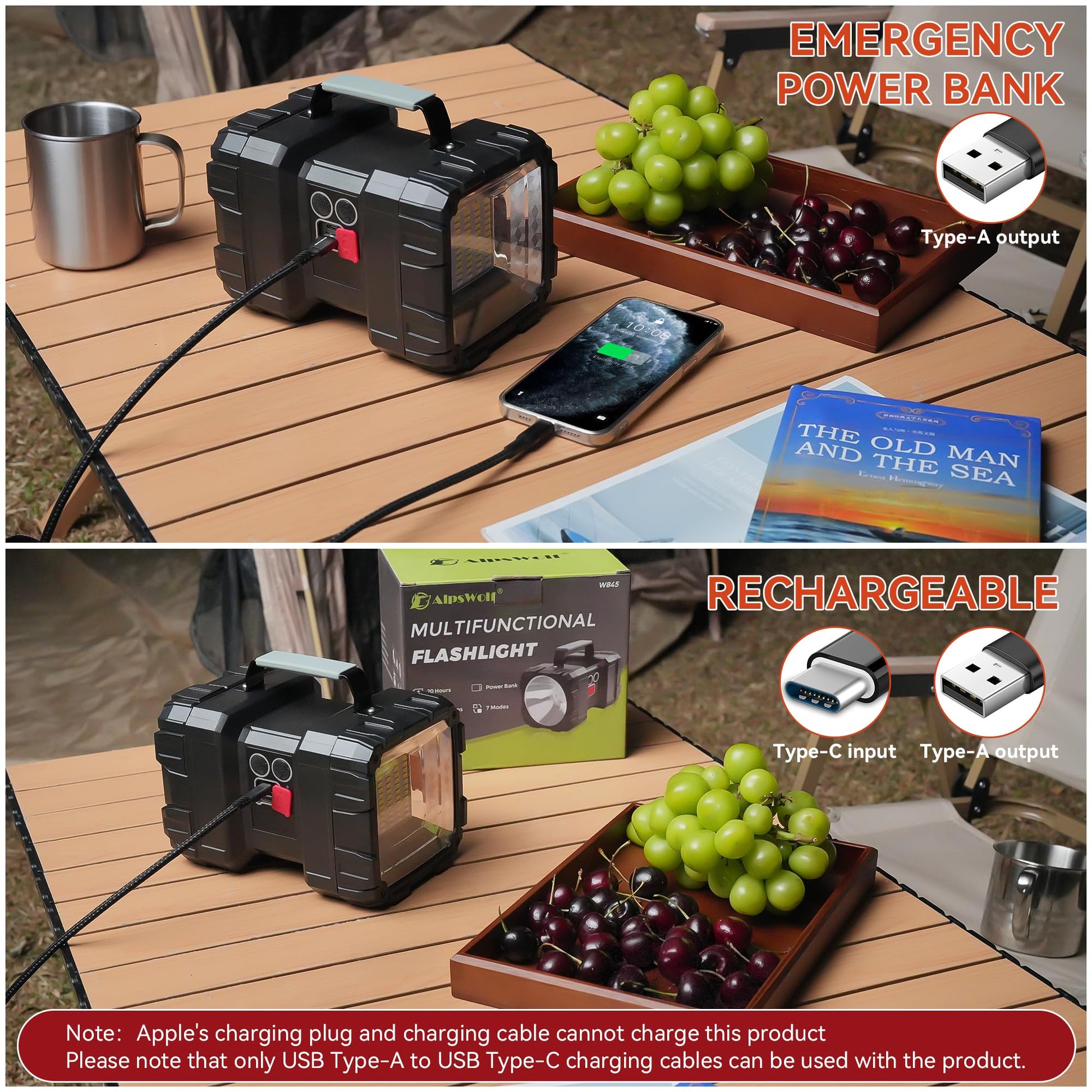 AlpsWolf Rechargeable Flashlight, LED Spotlight Flashlight 10000 Capacity 1200LM 20h Ultra-Long Standby 3+4 Lights Modes Camping Flashlight Waterproof with USB Output as a Power Bank