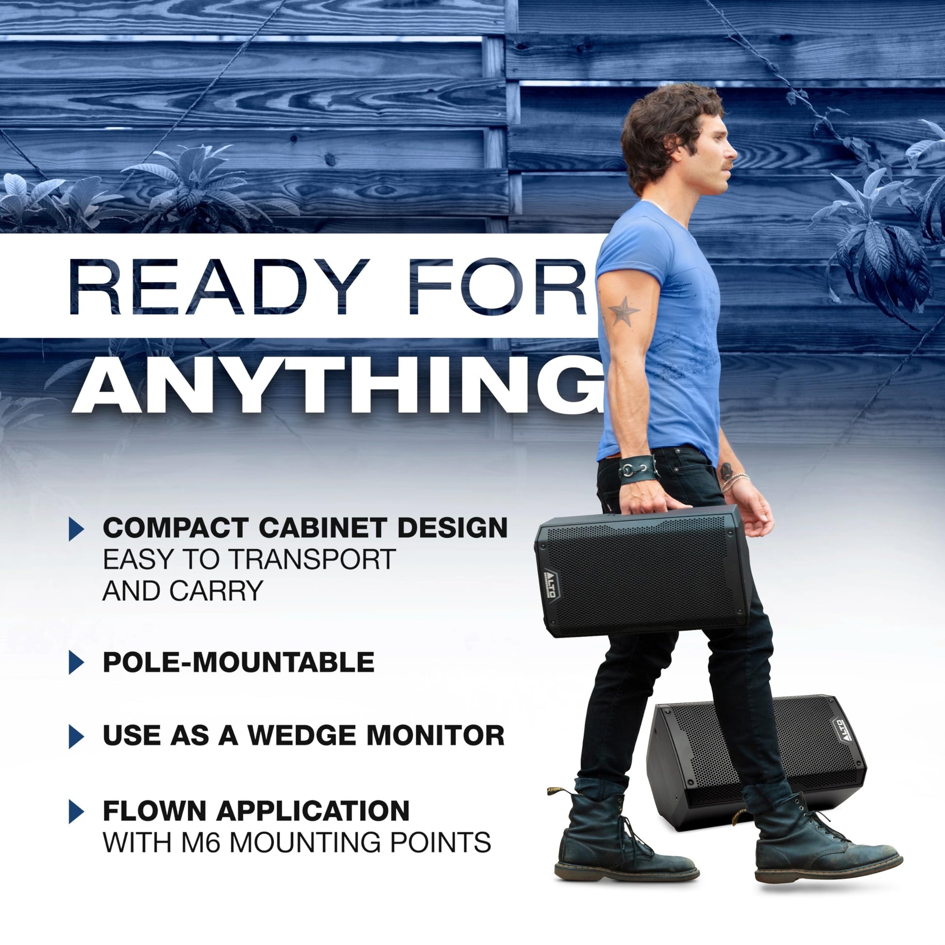 Ready for anything - compact, versatile design Each speaker features a lightweight, sleek, black box design that can be used as the application demands - freestanding, as a wedge monitor, pole-mounted, or suspended via the integrated suspension points.