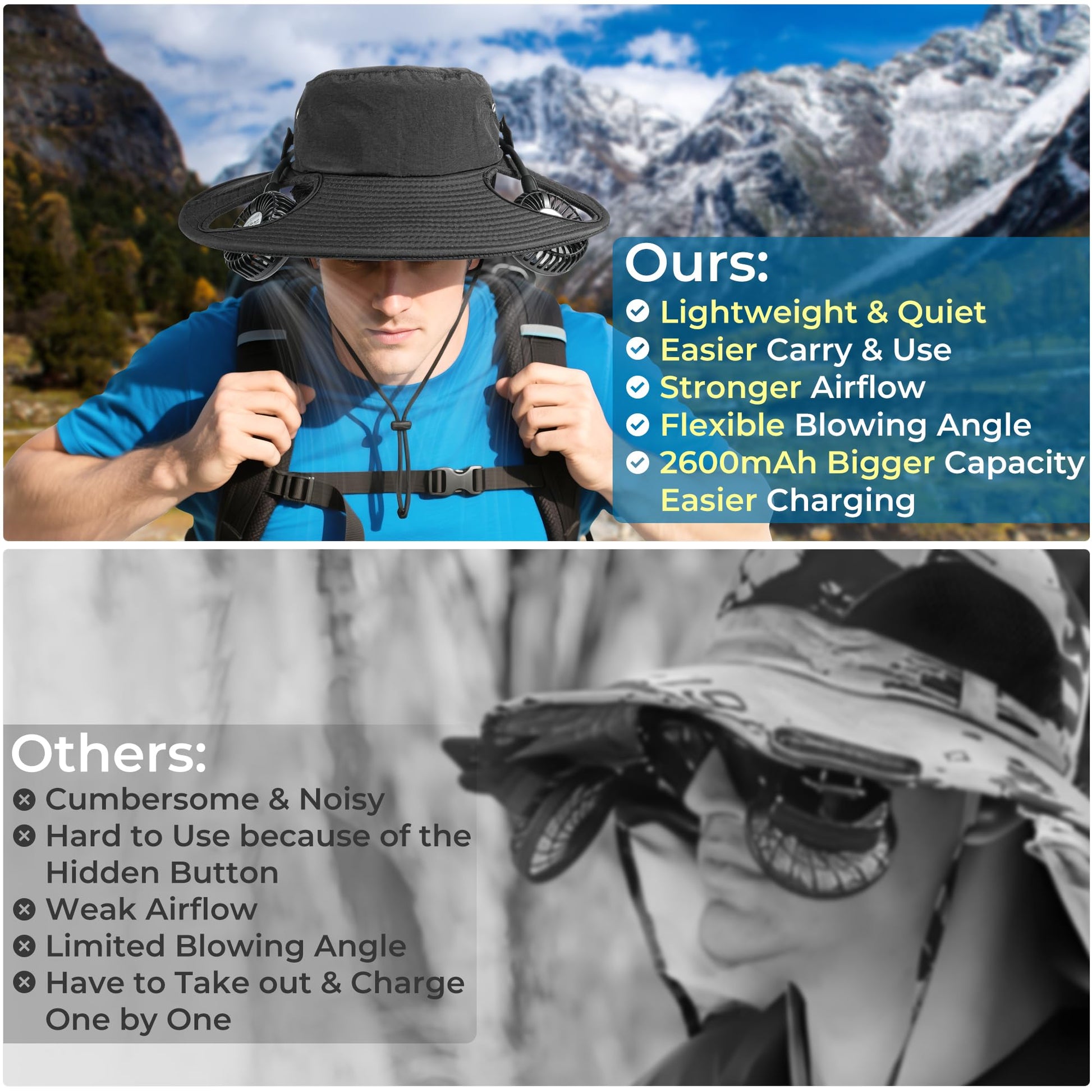 • 2-in-1 Built-in Fan for Instant Cooling: Wear the fan integrated into the hat or detach it to use as a standalone neck fan—custom cooling for any outdoor activity, delivering a direct breeze to your body while keeping your hands free
