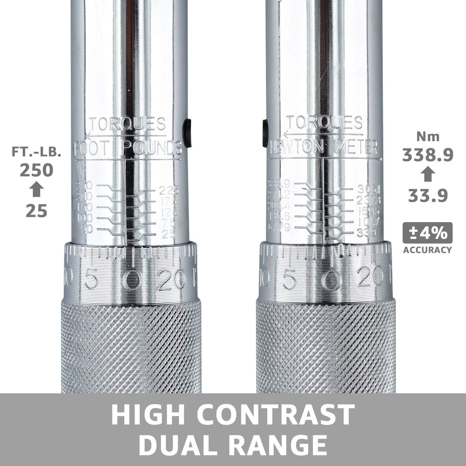 • HEAVY-DUTY PERFORMANCE: Handle a wide range of torque applications with precision using the 25-250 foot-lb/33.9-338.9 Nm range of this heavy-duty torque wrench