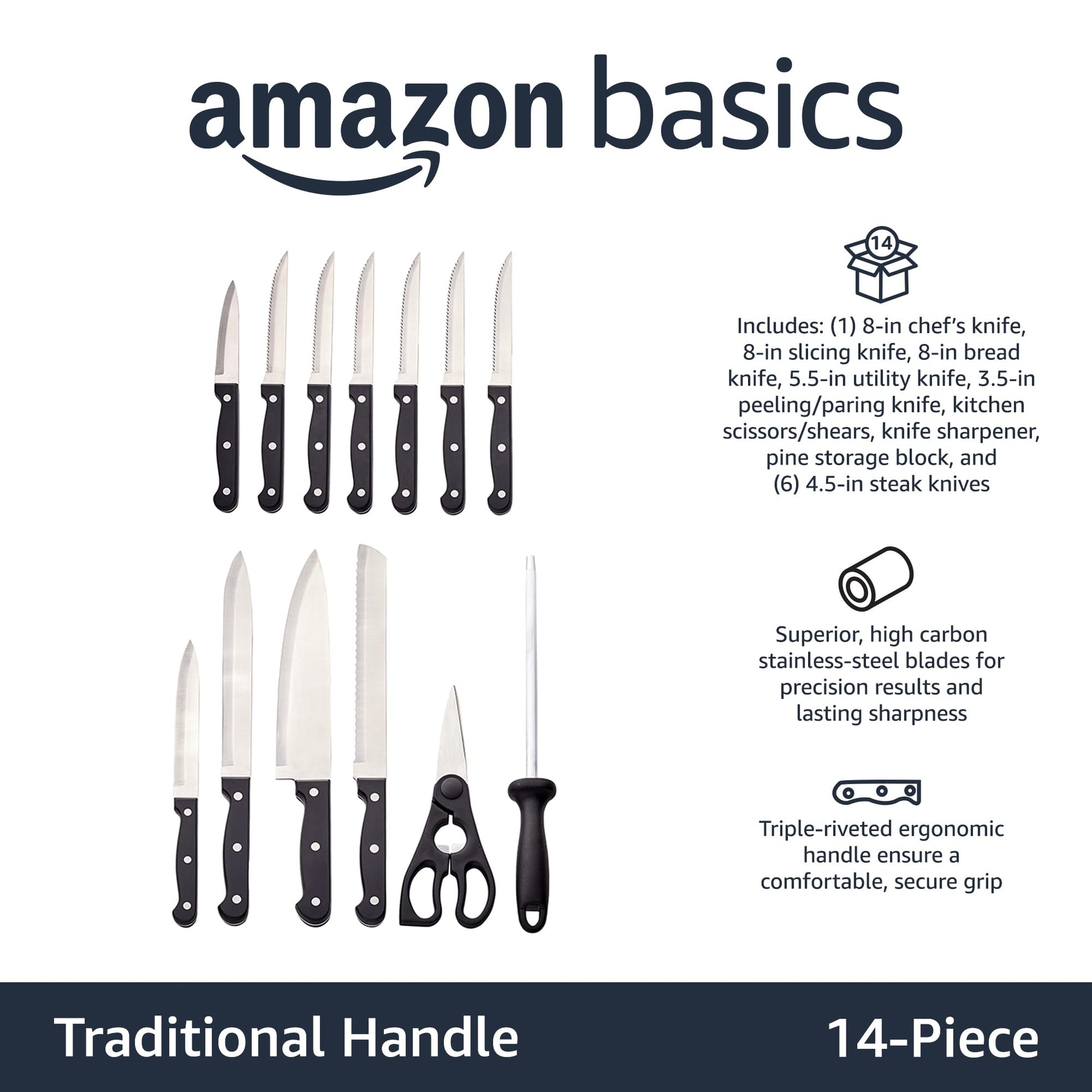 Amazon Basics 14-Piece High Carbon Stainless Steel Kitchen Knife Set with Sharpener and Pinewood Block, Black