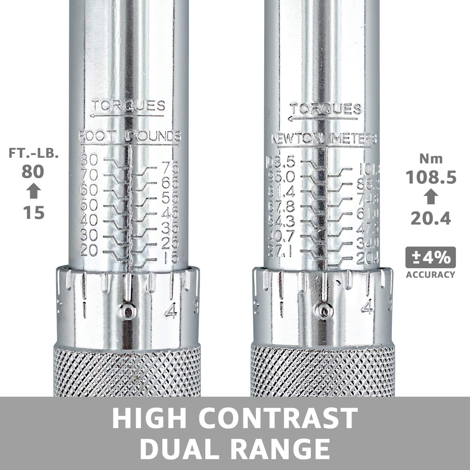 • High contrast and dual range scale pre-calibrated to ± 4%; tips: for precise scale adjustment, please use the imperial scale; the conversion formula between imperial scale and metric scale is 1 Nm = 8.86 in-lbs