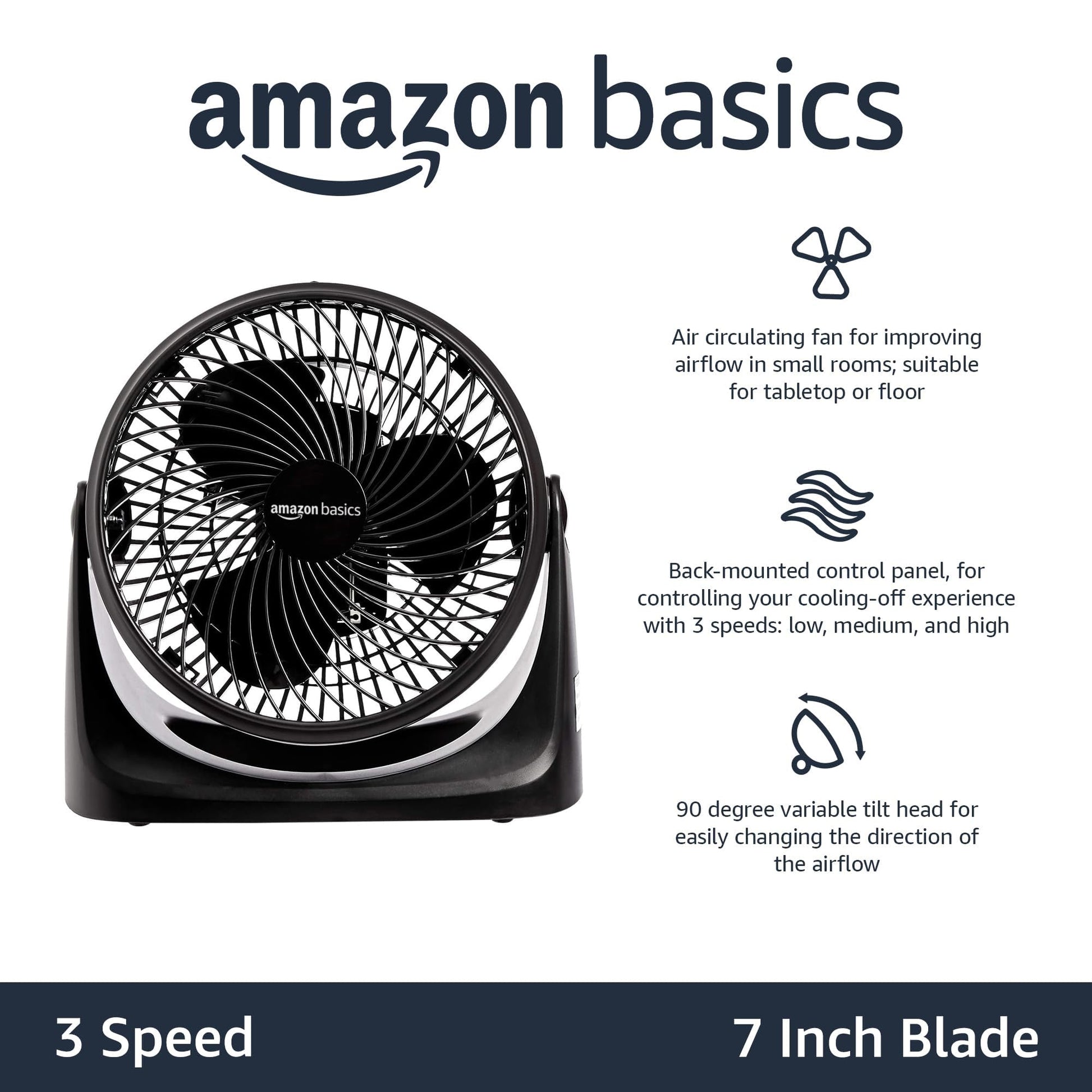 Amazon Basics Air Circulator Fan, Desk Fan for Bedroom, Home and Office, With 90-Degree Tilt Head, 3 Speed Settings, Lightweight (3 LBS), 35 Watts, Black, 11.1"W x 6.3"D x 10.9"H