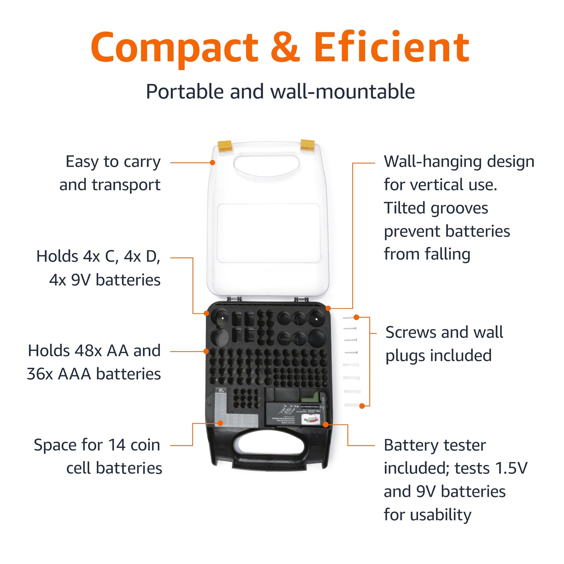 • Can hold 110 total batteries, including 36 AAA, 48 AA, 4 C, 4 D, 4 9V, 14 coin cells