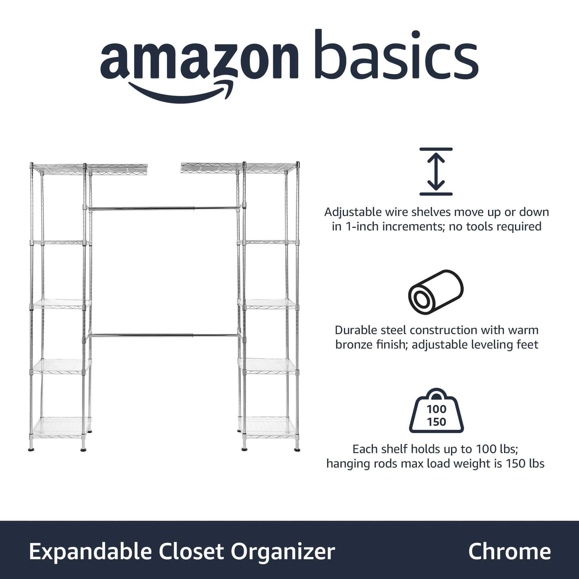 Amazon Basics Expandable Adjustable Metal Hanging Storage Organizer Rack Wardrobe with Shelves, 57-80 x 14 x 72 inches (LxWxH), Chrome