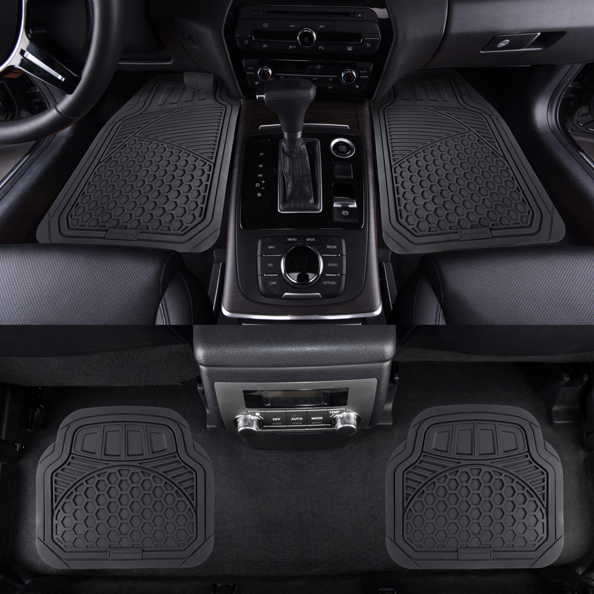 Amazon Basics Heavy Duty Car Floor Mat, PVC Faux Rubber, with Carpet Backing, Universal Deluxe All-Weather Trim to Fit for 95% Automotive SUV Sedans Trucks, 4-Piece, Solid Black