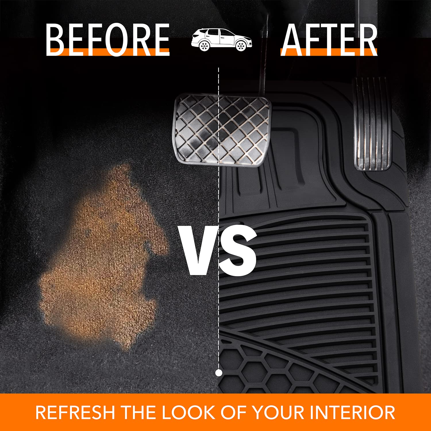 • These heavy duty floor mats are made of thick PVC to provide maximum all-weather protection for your car's interior without deforming or cracking, whether it's snowy, rainy, or muddy outside.