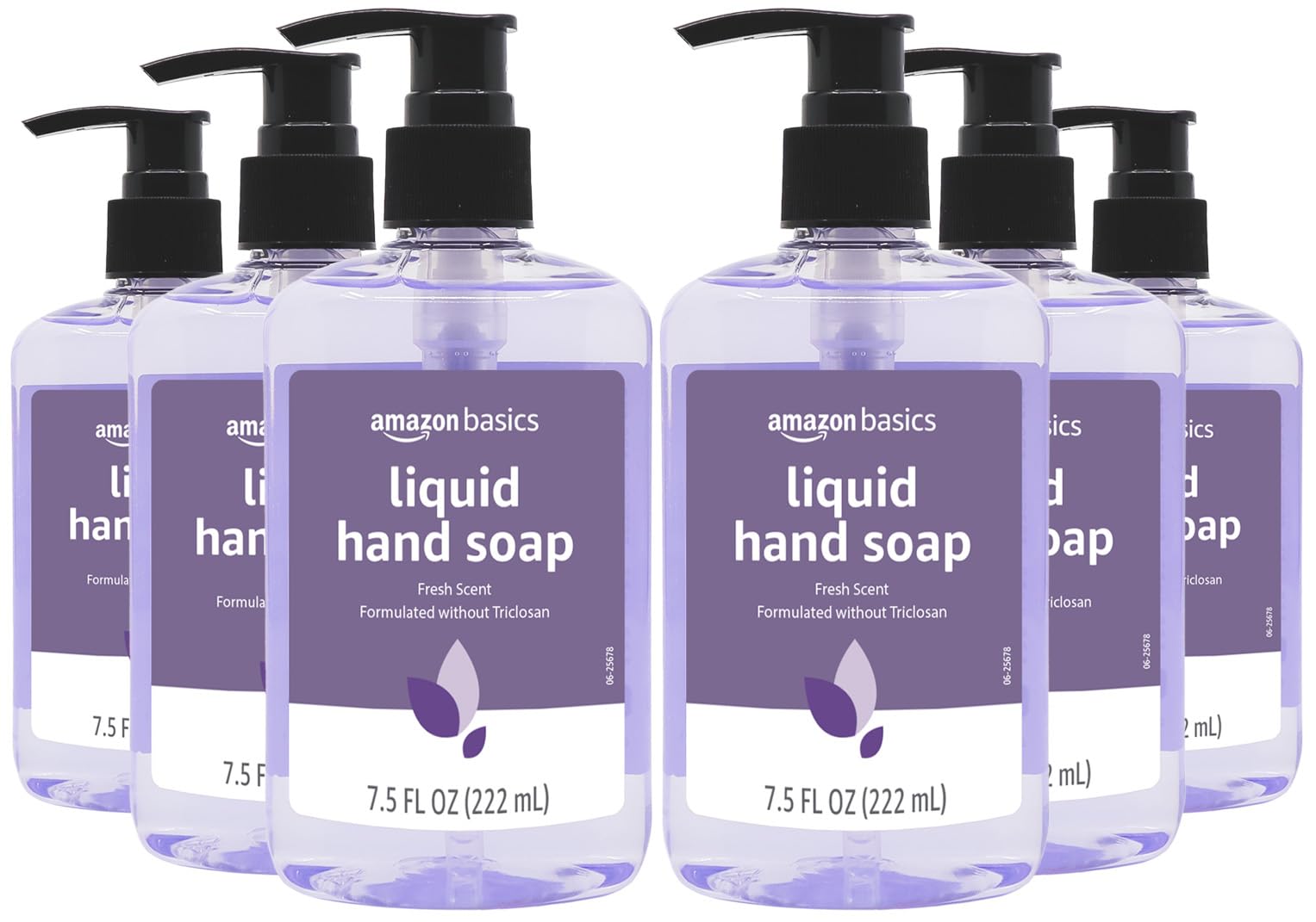 • Six 7.5 fluid-ounce bottles of Amazon Basics Original Fresh Liquid Hand Soap
