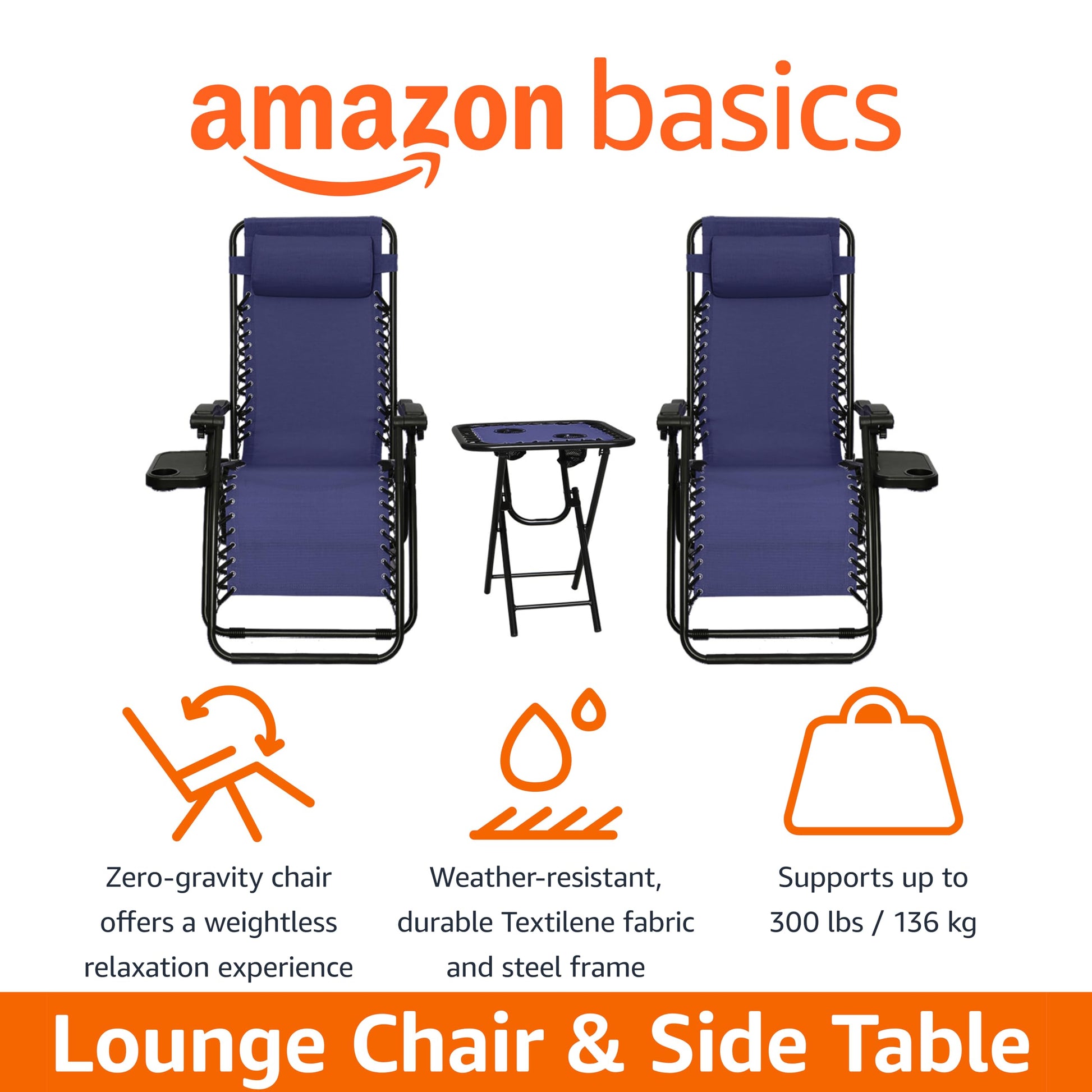 Amazon Basics Outdoor Textilene Adjustable Zero Gravity Folding Reclining Lounge Chair Set with Side Table, pack of 2, Blue