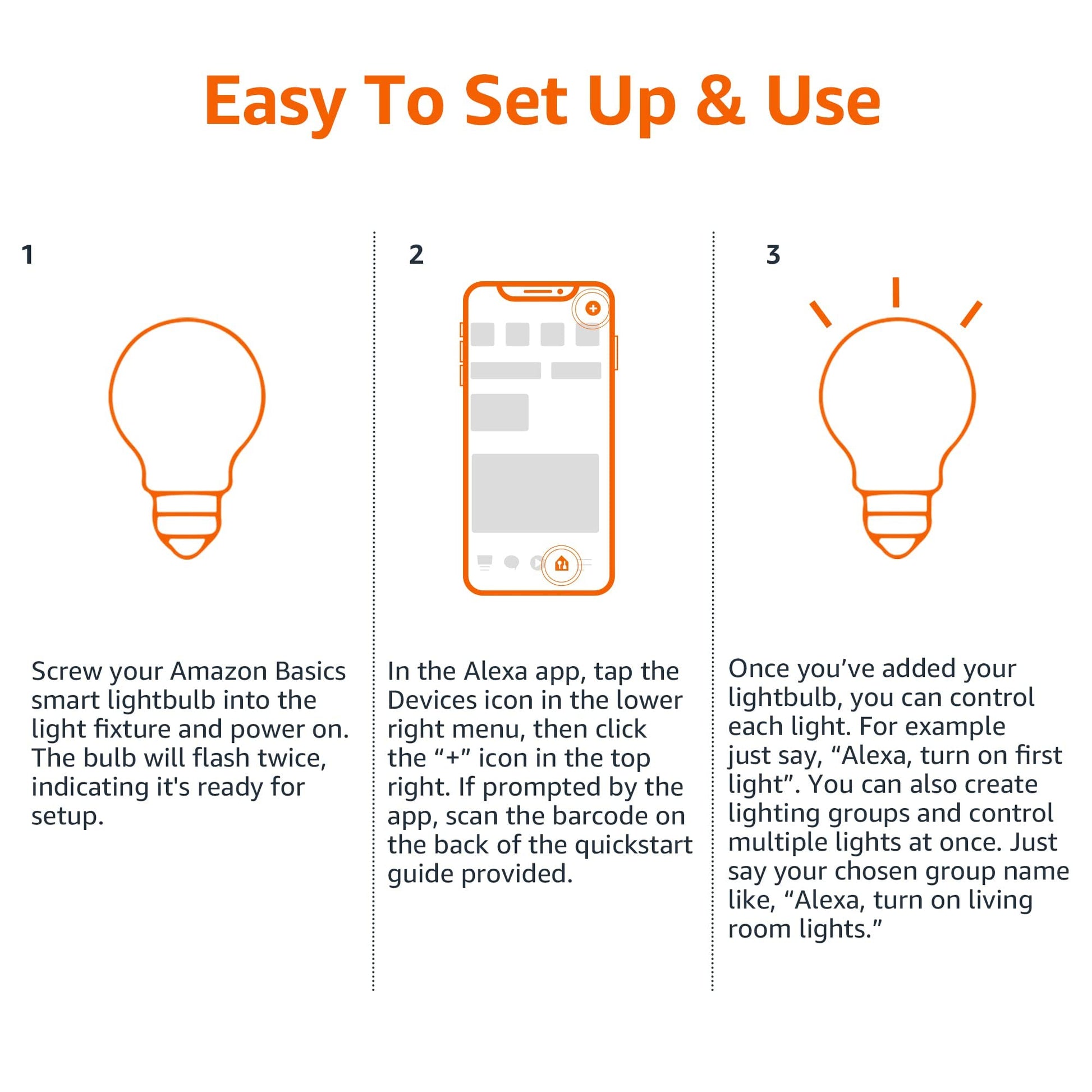SIMPLE TO SET UP WITH ALEXA: Screw in the light bulb, open the Alexa app, and get started in minutes as you get notified “ First light bulb found”. Otherwise, you can add the smart bulb directly from Alexa app. No hubs or 3rd party apps or skills required. For zero touch set up experience, check “Link device to your Amazon account to simplify setup” during checkout and get started with your smart bulb in no time. Note: Amazon Basics smart light bulbs work exclusively with Alexa to be set up with 2.4GHz Wi-Fi only.