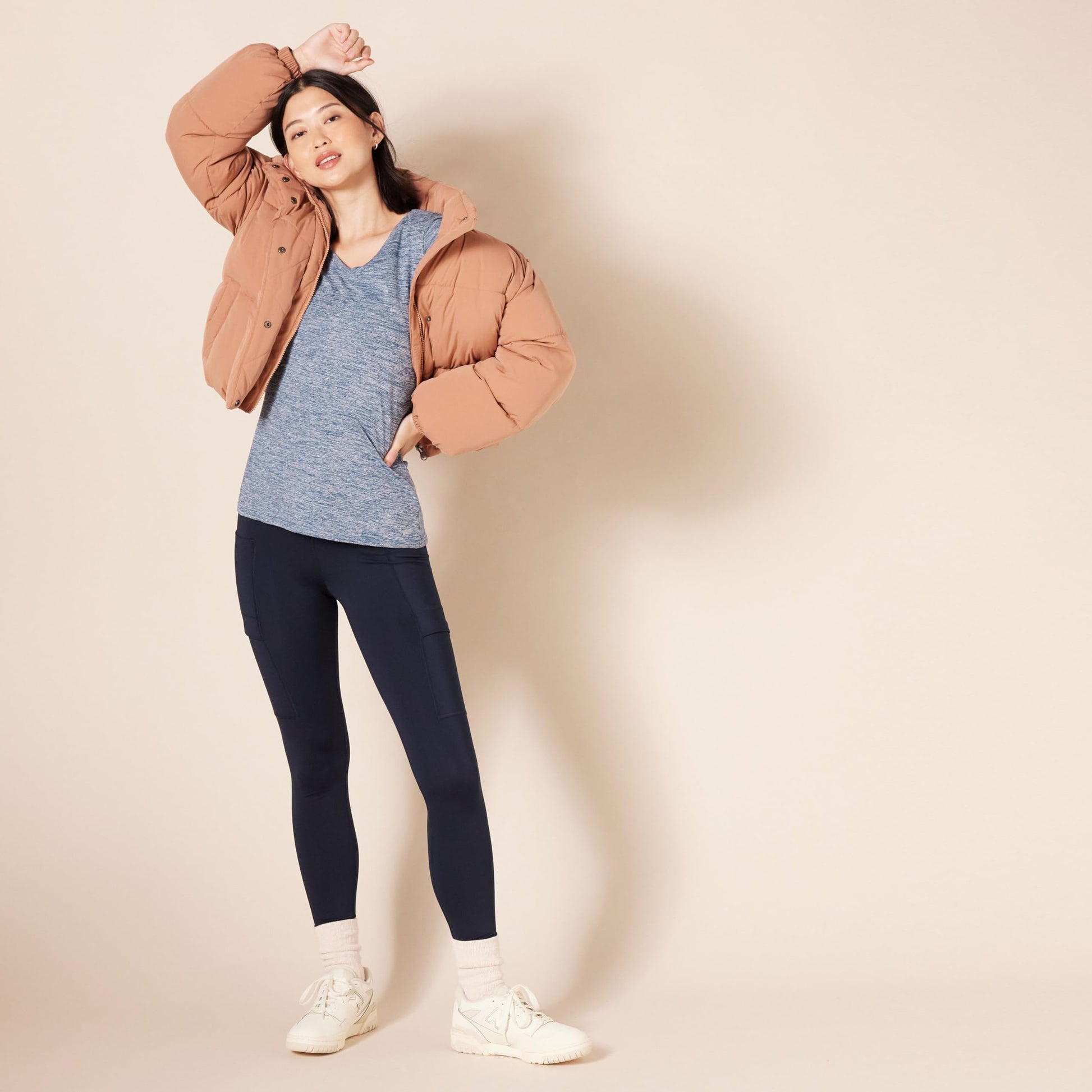 Amazon Essentials Women's Active Quick Dry Tech Stretch Short-Sleeve V-Neck T-Shirt (Available in Plus Size), Pack of 2, Black Heather/Navy Heather, Large