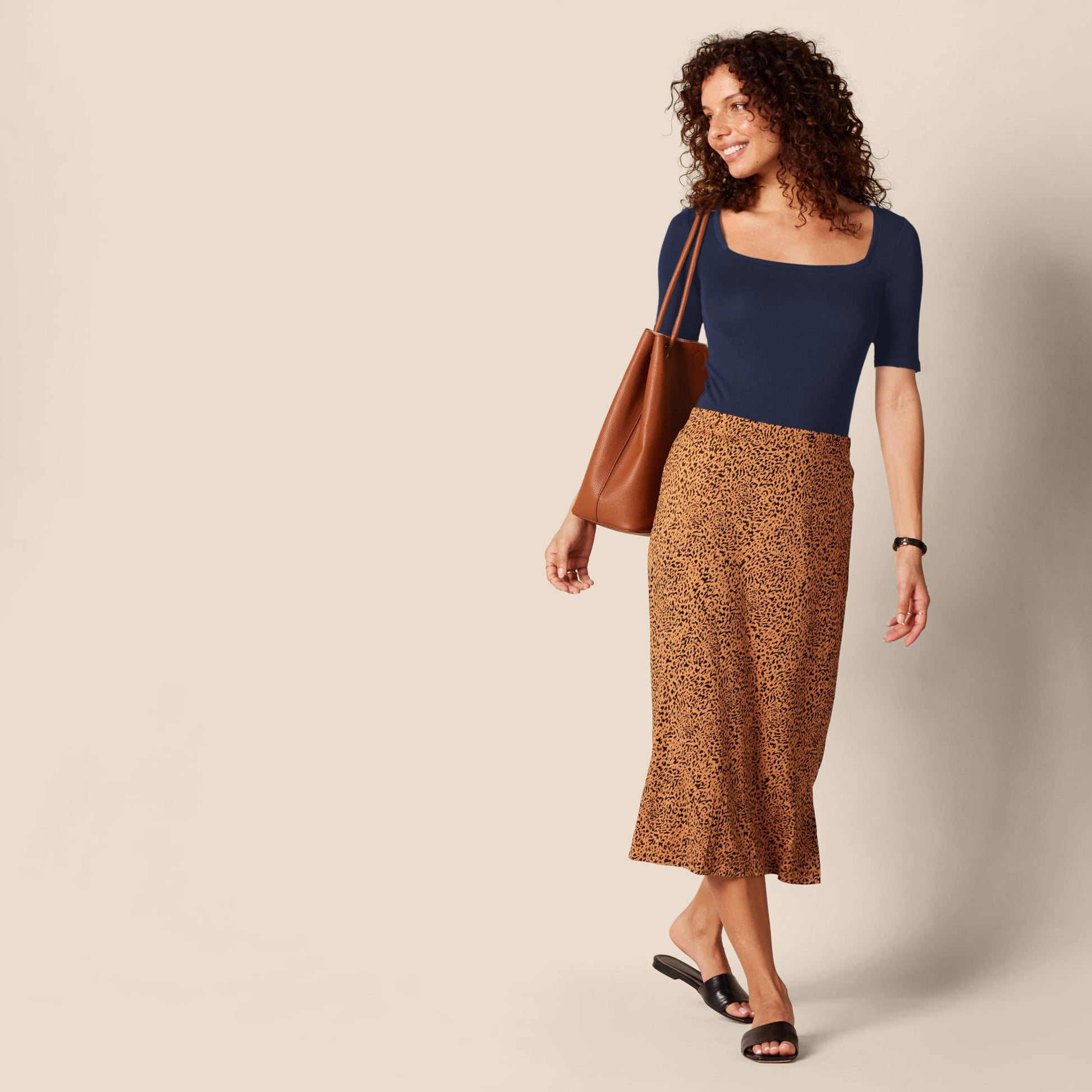 DETAILS: Features a modern square neck and half-length sleeves in a fitted silhouette.