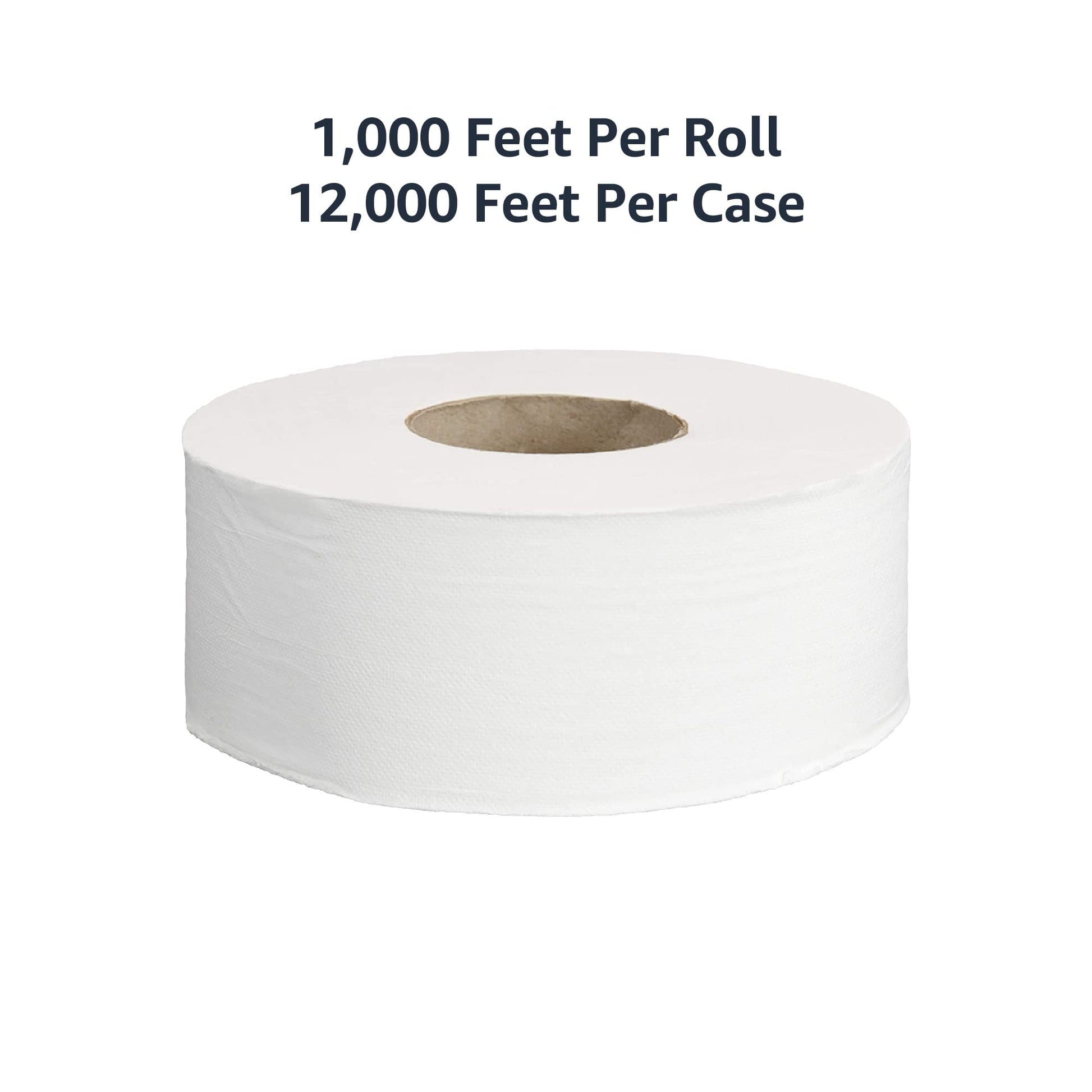 Details: Our AmazonCommercial 2-Ply White 9' Jumbo Roll Toilet Paper/Bath Tissue pack contains (12) Jumbo Toilet Tissue Rolls (1,000 feet per roll; 12,000 feet total). With 12 rolls, this pack is ideal for away-from-home facilities such as, high-traffic commercial buildings, offices, restaurants, public restrooms, schools, hotels and healthcare. We make set up and refilling easy, as our product works with any 9-inch jumbo roll toilet paper dispensers found in commercial applications. We are committed to using Forest Stewardship Council (FSC) certified paper, ensuring that our products come from forests managed pursuant to strict environmental, social, and economic standards.