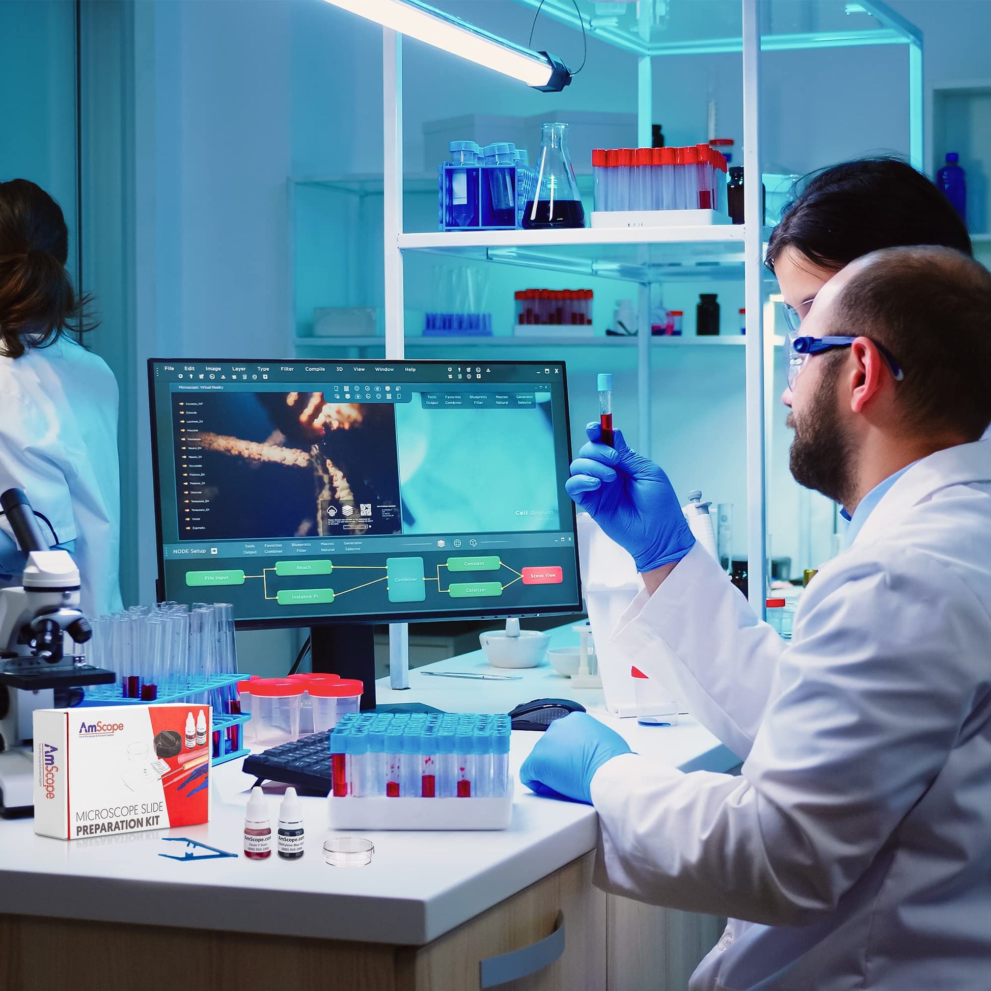 AmScope Microscope Slide Preparation Kit - Includes Blank Microscope Slides, Eosin Red & Methylene Blue Stain Powders, Tweezers, Swab & More - 22-Piece Kit