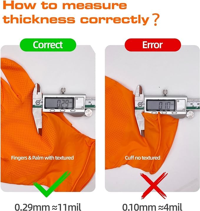 • HIGH-VISIBILITY ORANGE COLOR: The bold orange color makes the nitrile gloves and your hand easily recognizable and alerting even in darker environments, greatly improving safety in heavy-duty tasks such as mechanic, automotive, construction, and manufacturing.