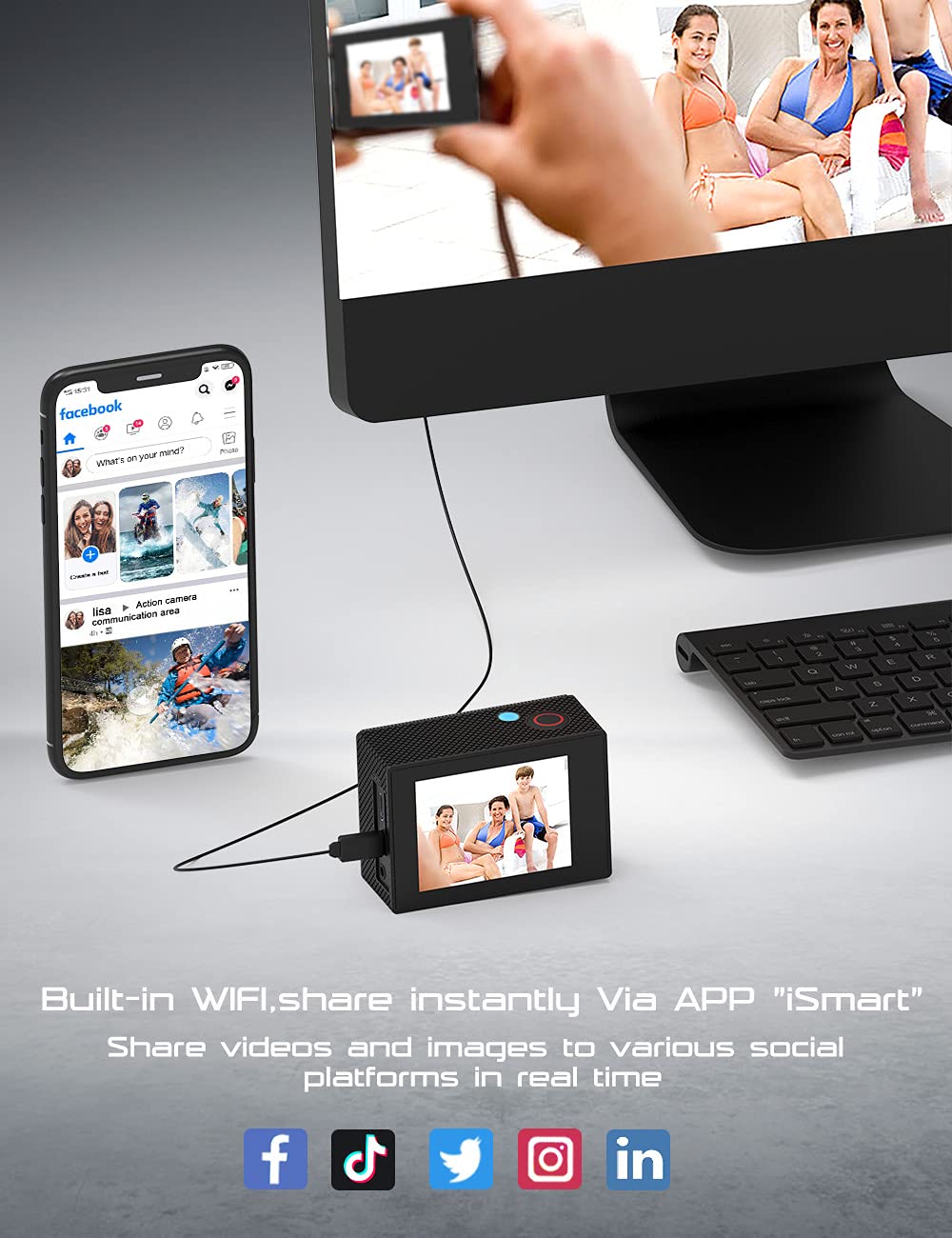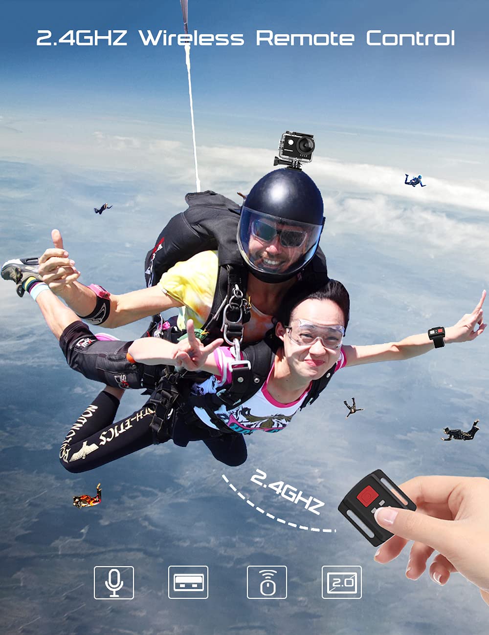 • 【WIFI and 2.4G Remote Control】:Just download App (iSmart) on your phone or tablet and connect with this 4k action camera.By connecting WiFi with 2.4G remote remote shooting, the remote control range is up to 15 meters. Note:The remote is not waterproof.