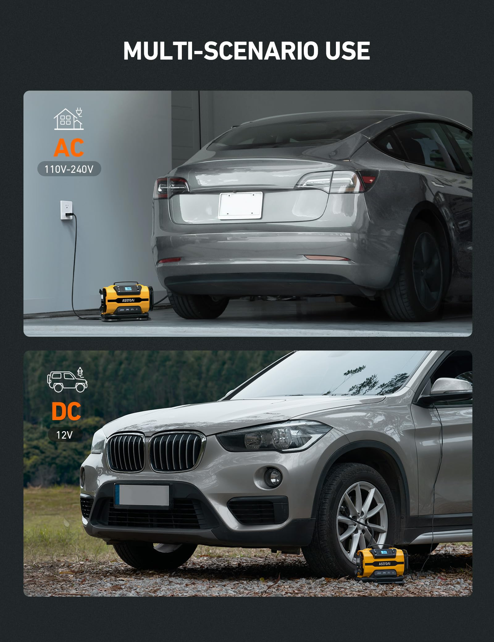 AstroAI Tire Inflator Portable Air Compressor Pump 150PSI 12V DC/110V AC with Dual Metal Motors &LED Light, Automotive Car Accessories&Two mode for car, bicycle tires and air mattresses, Yellow