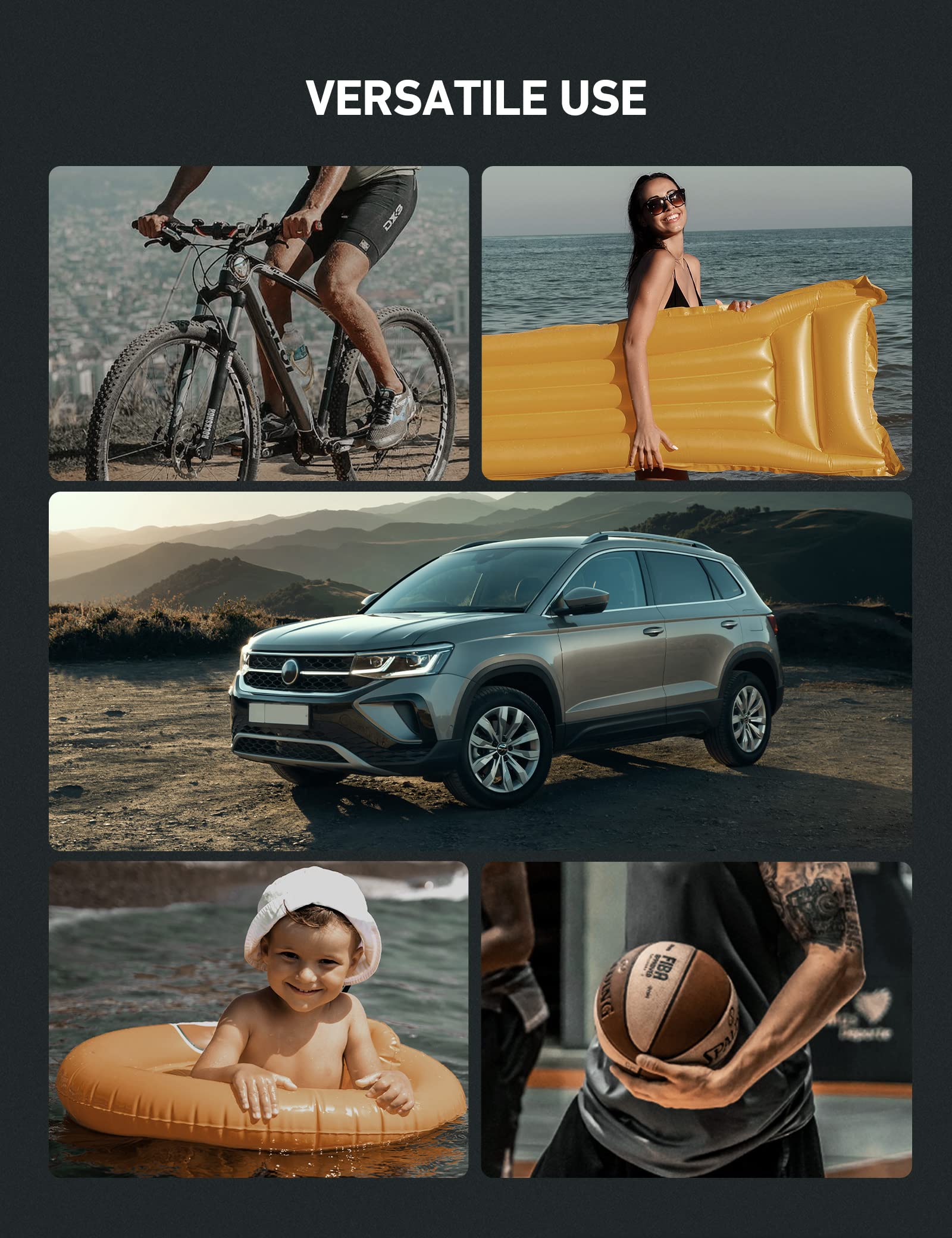 • Fast Inflation & 15-Minute Continuous Work: With dual metal motors and a metal cylinder, the tire inflator can continuously work for up to 15 mins. Large-volume mode provides a maximum inflation rate of 350 L/min, quickly inflating large items. High-pressure mode pumps up to 150 PSI, inflating a flat tire from 0 PSI to 36 PSI in 6 minutes. Compatible with cars, bikes, sedans and mid-sized SUVs. NOTE: This pump is incompatible with heavy-duty trucks. Please let the pump cool for at least 10 minutes after every 15 minutes of use.